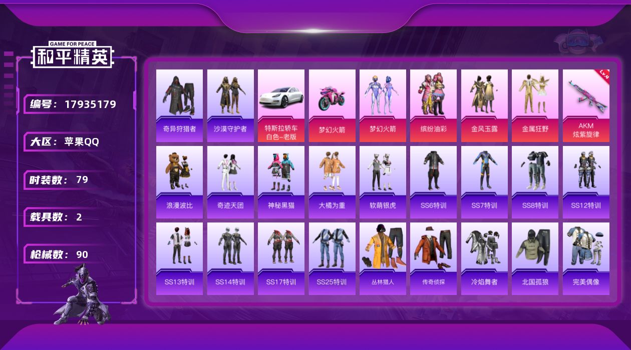 [17935179]可二次【特价出售/店主推荐】苹果 手Q-4粉装-1特效枪-2载具-3粉色飞行器-33538热力值-0王牌印记-79套装-90枪皮 【热门品类】:粉装-梦幻火箭,粉装-缤纷油彩,套装-奇异狩猎者,套装-沙漠守护者,套装-浪漫波比 【粉色套装】:粉装-梦幻火箭,粉装-金风玉露,粉装-金属狂野,粉装-缤纷油彩 【粉色枪皮等级】:AKM-炫紫旋律(四级) 【粉色载具】:特斯拉Model 3(珍珠白),双人摩托-梦幻火箭 【粉色枪皮】:AKM-炫紫旋律 【粉色飞行器】:春暖花开飞行器,梦幻火箭飞行器,炫紫旋律飞行器 【粉色降落伞】:百万伏特降落伞,春暖花开降落伞,梦幻火箭降落伞,神秘黑猫降落伞,四圣焕新降落伞,香水柠檬降落伞 【稀有枪皮】:AKM-夜灯,AKM-春暖花开,AKM-沙漠守护者,AKM-生命誓言,AKM-破晓战魂,AKM-霓虹街区,M16A4-幻世战舞者,M16A4-红色方程式,SCAR-L-炫彩节奏,SCAR-L-玉兔迎春,SCAR-L-红色方程式,M416-潮汐统领,M416-神秘黑猫,M416-红色方程式,M416-蓝色火焰,GROZA-春暖花开,GROZA-黑色刀锋,AUG-耀粉歌者,QBZ-原初圣火,QBZ-神秘黑猫,M762-拳皇97,M762-牛气冲天,M762-镭射皇者,G36C-不夜海上花,UZI-炫彩节奏,UZI-金风玉露,UMP45-春暖花开,Vector-彩虹符号,Vector-黑色刀锋,汤姆逊-勇闯险境,汤姆逊-耀粉歌者,Kar98K-勇闯险境,Kar98K-彩虹符号,Kar98K-梦幻火箭,SKS-勇闯险境,SKS-夜灯,VSS-镭射皇者,VSS-黑色刀锋,Mini14-原初圣火,Mini14-春暖花开,Mini14-梦幻火箭,Mini14-金鼠迎春,SLR-四圣焕新,SLR-沙漠守护者,QBU-不夜海上花,S686-冰封烈焰,S686-生命誓言,S1897-勇闯险境,S1897-春暖花开,S1897-潮汐统领,S1897-神秘黑猫,S1897-镭射皇者,S12K-破晓战魂,M249-拳皇97,M249-镭射皇者,DP-28-原初圣火,DP-28-沙漠守护者,MG3-幻世战舞者,P92-拳皇97,P1911-冰封烈焰,P18C-原初圣火 【其他套装】:套装-SS6特训,套装-SS7特训,套装-SS8特训,套装-SS12特训,套装-SS