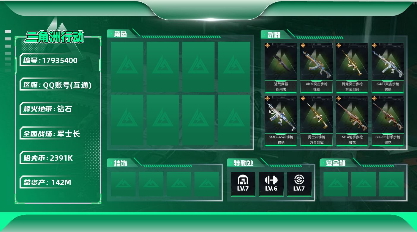 [17935400]142m总资产-2391k哈夫币-60烽火等级-钻石-19战场等级-军士长 【近战皮肤】:近战-处刑者1级,近战-黑鹰 【传说外观】:AKM突击步枪-锦绣,AUG突击步枪-悠然茶歇,腾龙突击步枪-万金泪冠,K437突击步枪-锦绣,MK47突击步枪-悠然茶歇,UZI冲锋枪-悠然茶歇,SMG-45冲锋枪-锦绣,勇士冲锋枪-万金泪冠,M14射手步枪-缄花,SR-25射手步枪-缄花,AWM狙击步枪-万金泪冠,.357左轮-缄花 【史诗外观】:K416突击步枪-冬日风情,AUG突击步枪-蝮蛇,SG552突击步枪-哈夫克警备,MP5冲锋枪-竞技风,SMG-45冲锋枪-阿萨拉特攻,MP7冲锋枪-六套之力,S12K霰弹枪-曙光,QJB201轻机枪-炽焰,M14射手步枪-工业狂潮,SV-98狙击步枪-囚徒,M700狙击步枪-蝮蛇,M700狙击步枪-哈夫克警备 【稀有外观】:SR-3M紧凑突击步枪-巨兽,AKM突击步枪-肃杀,K416突击步枪-一帆风顺,SG552突击步枪-2026,SG552突击步枪-贴花艺术, AK-12突击步枪-马年新春,MP5冲锋枪-哈夫克卫队,SMG-45冲锋枪-行动开启,SMG-45冲锋枪-幻影结构,勇士冲锋枪-冰天雪地,QCQ171冲锋枪-银鹭,M1014霰弹枪-幻影结构,M249轻机枪-冰天雪地,SKS射手步枪-弄臣,SV-98狙击步枪-星链科技,SV-98狙击步枪-哈夫克航天,SV-98狙击步枪-精英联盟,QSZ92G-一帆风顺,G18-星链科技,G18-哈夫克航天 【普通外观】:腾龙突击步枪-古铜,S12K霰弹枪-古铜,M4A1突击步枪-高雅黑,M4A1突击步枪-海色,QBZ95-1突击步枪-高雅黑,QBZ95-1突击步枪-海浪,QBZ95-1突击步枪-海色,QBZ95-1突击步枪-2026,腾龙突击步枪-三角洲力量,K416突击步枪-几何迷彩,K416突击步枪-高雅黑,M16A4突击步枪-高雅黑,AUG突击步枪-浅蓝涂装,M7战斗步枪-红色涂装,M7战斗步枪-黑巧甜心,SG552突击步枪-海浪,SCAR-H战斗步枪-数码迷彩,G3战斗步枪-高雅黑,PTR-32突击步枪-黄蜂,CAR-15突击步枪-狂欢,AS Val突击步枪-黑巧甜心,MP5冲锋枪-三角洲力量,MP5冲锋枪-海色,MP5冲锋枪-黄蜂,P90冲锋枪-黑巧甜心,Vector冲锋枪-几何