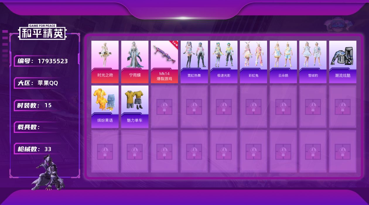 - PX_2083606- 苹果手Q-17王牌印记-有战神框-8粉装-7特效枪-3载具-80123热力值-162套装-236枪皮-1卓越印记-1传奇印记 【8粉装】,梦幻火箭,宝贝奶油派,洛天依,幻彩电音,荧海星豚,木曜青龙,相思残雪,星之彼岸 【7特效枪】AKM-星际浪客-7级 SCAR-L-梦幻火箭-6级 M416-心之恋语-7级 GROZA-旋转彩虹-5级 Kar98K-巳巳如意-5级 DP-2