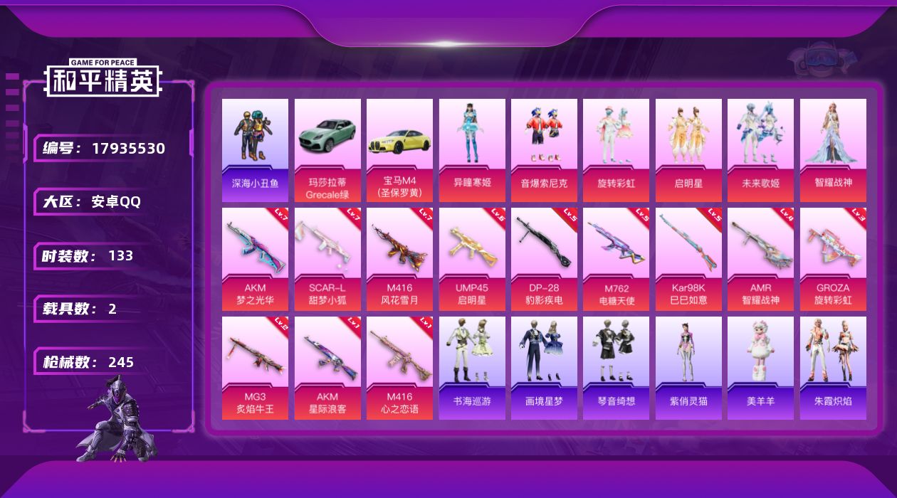 [17935530]可二次【特价出售/店主推荐】安卓 手Q-6粉装-16特效枪-2载具-1粉色飞行器-75607热力值-1王牌印记-133套装-245枪皮【热门品类】:粉装-音爆索尼克,套装-深海小丑鱼,套装-龟仙【粉色套装】:粉装-旋转彩虹,粉装-启明星,粉装-音爆索尼克,粉装-未来歌姬,角色-智耀战神,角色-异瞳寒姬【粉色枪皮等级】:AKM-梦之光华(七级),AKM-星际浪客(一级),SCAR-L-甜梦小狐(七级),M416-心之恋语(一级),M416-风花雪月(七级),GROZA-旋转彩虹(三级),M762-电糖天使(五级),ACE32-萌骑漫游(一级),UMP45-启明星(六级),AKS-74U-森灵之息(五级),Kar98K-巳巳如意(五级),Mk14-福马献瑞(三级),AMR-智耀战神(四级),DP-28-豹影疾电(五级),MG3-炙焰牛王(二级),PKM-萌骑夺宝(二级)【粉色载具】:玛莎拉蒂Grecale(薄荷绿),宝马M4(圣保罗黄)【粉色枪皮】:AKM-梦之光华,AKM-星际浪客,SCAR-L-甜梦小狐,M416-心之恋语,M416-风花雪月,GROZA-旋转彩虹,M762-电糖天使,ACE32-萌骑漫游,UMP45-启明星,AKS-74U-森灵之息,Kar98K-巳巳如意,Mk14-福马献瑞,AMR-智耀战神,DP-28-豹影疾电,MG3-炙焰牛王,PKM-萌骑夺宝【粉色飞行器】:炫彩糖果飞行器
