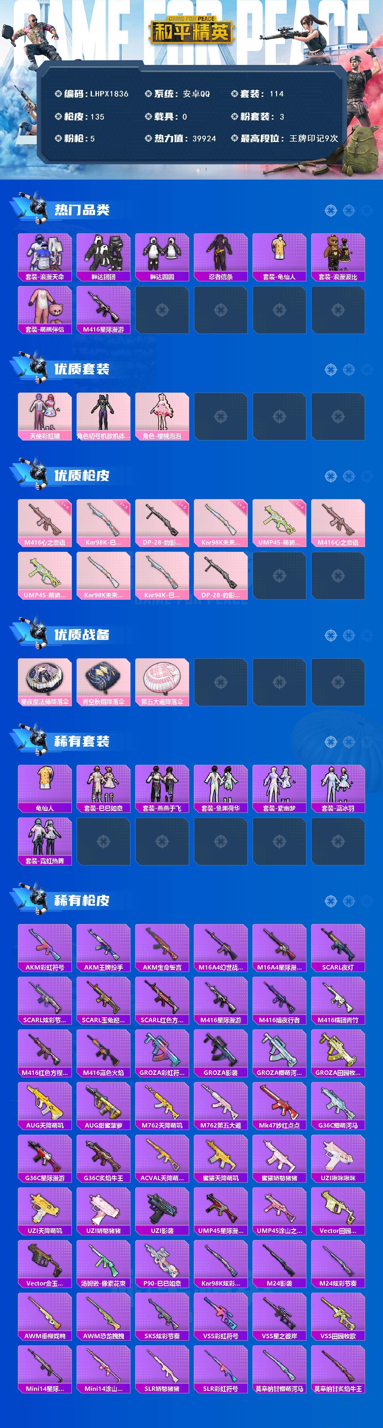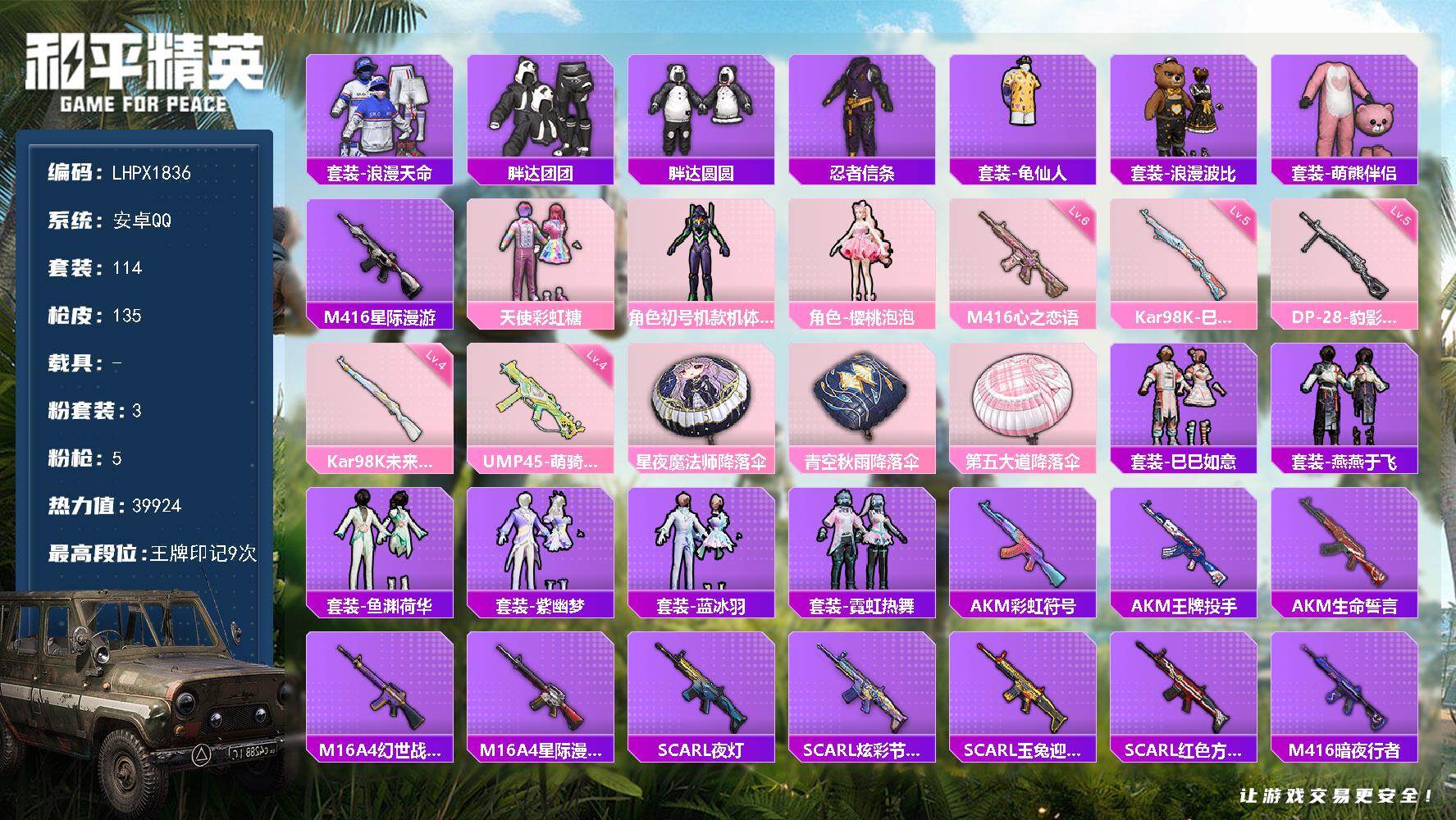 [17935888]【特价出售/店主推荐】安卓 手Q-3粉装-5特效枪-0载具-0粉色飞行器-39924热力值-9王牌印记-114套装-135枪皮 【热门品类】:套装-浪漫天命,套装-胖达团团,套装-胖达圆圆,套装-忍者信条,套装-龟仙人,套装-浪漫波比,套装-萌熊伴侣,M416-星际漫游 【粉色套装】:粉装-天使彩虹糖,角色-初号机款机体服,角色-樱桃泡泡 【粉色枪皮等级】:M416-心之恋语(六级),UMP45-萌骑冒险(四级),Kar98K-未来歌姬(四级),Kar98K-巳巳如意(五级),DP-28-豹影疾电(五级) 【粉色枪皮】:M416-心之恋语,UMP45-萌骑冒险,Kar98K-未来歌姬,Kar98K-巳巳如意,DP-28-豹影疾电 【粉色降落伞】:星夜魔法师降落伞,青空秋雨降落伞,第五大道降落伞 【稀有套装】:套装-龟仙人,套装-巳巳如意,套装-雪国风尚,套装-燕燕于飞,套装-鱼渊荷华,套装-紫幽梦,套装-蓝冰羽,套装-霓虹热舞 【稀有枪皮】:AKM-彩虹符号,AKM-王牌投手,AKM-生命誓言,M16A4-幻世战舞者,M16A4-星际漫游,SCAR-L-夜灯,SCAR-L-炫彩节奏,SCAR-L-玉兔迎春,SCAR-L-红色方程式,M416-星际漫游,M416-暗夜行者,M416-糯团青竹,M416-红色方程式,M416-蓝色火焰,GROZA-彩虹符号,GROZA-影袭,GROZA-懵萌河马,GROZA-田园牧歌,AUG-天降萌叽,AUG-甜蜜菠萝,M762-天降萌叽,M762-第五大道,Mk47-妙红点点,G36C-懵萌河马,G36C-星际漫游,G36C-炙焰牛王,AC-VAL-天降萌叽,蜜獾-天降萌叽,蜜獾-娇憨猪猪,UZI-啾咪啾咪,UZI-天降萌叽,UZI-娇憨猪猪,UZI-影袭,UMP45-星际漫游,UMP45-涂山之恋,Vector-田园牧歌,Vector-金玉无双,汤姆逊-像素花束,P90-巳巳如意,Kar98K-炫彩节奏,M24-影袭,M24-炫彩节奏,AWM-垂柳戏鸭,AWM-恐龙拽拽,SKS-炫彩节奏,VSS-彩虹符号,VSS-星之彼岸,VSS-田园牧歌,Mini14-星际漫游,Mini14-涂山之恋,SLR-娇憨猪猪,SLR-彩虹符号,莫辛纳甘-懵萌河马,莫辛纳甘-炙焰牛王,AMR-妙红点点,S686-灵感创作师,S686-巳巳如意,S189