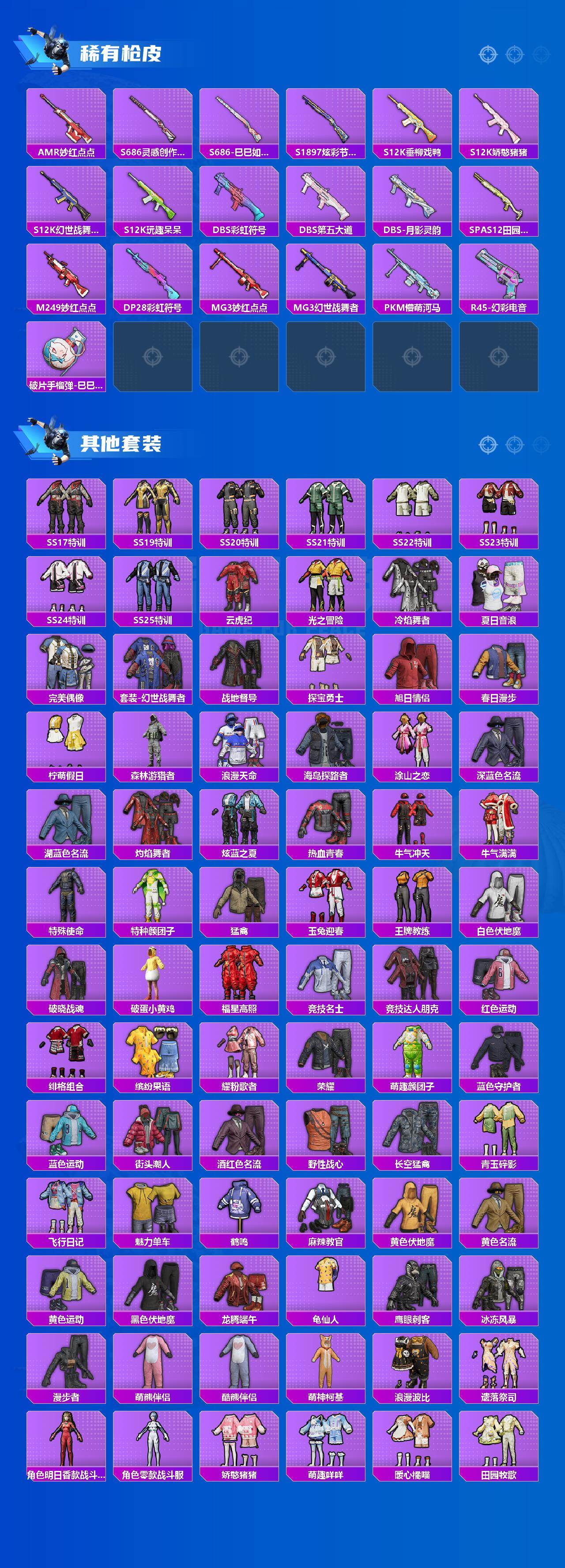 【稀有枪皮】:AKM-彩虹符号,AKM-王牌投手,AKM-生命誓言,M16A4-幻世战舞者,M16A4-星际漫游,SCAR-L-夜灯,SCAR-L-炫彩节奏,SCAR-L-玉兔迎春,SCAR-L-红色方程式,M416-星际漫游,M416-暗夜行者,M416-糯团青竹,M416-红色方程式,M416-蓝色火焰,GROZA-彩虹符号,GROZA-影袭,GROZA-懵萌河马,GROZA-田园牧歌,AUG-天降萌叽,AUG-甜蜜菠萝,M762-天降萌叽,M762-第五大道,Mk47-妙红点点,G36C-懵萌河马,G36C-星际漫游,G36C-炙焰牛王,AC-VAL-天降萌叽,蜜獾-天降萌叽,蜜獾-娇憨猪猪,UZI-啾咪啾咪,UZI-天降萌叽,UZI-娇憨猪猪,UZI-影袭,UMP45-星际漫游,UMP45-涂山之恋,Vector-田园牧歌,Vector-金玉无双,汤姆逊-像素花束,P90-巳巳如意,Kar98K-炫彩节奏,M24-影袭,M24-炫彩节奏,AWM-垂柳戏鸭,AWM-恐龙拽拽,SKS-炫彩节奏,VSS-彩虹符号,VSS-星之彼岸,VSS-田园牧歌,Mini14-星际漫游,Mini14-涂山之恋,SLR-娇憨猪猪,SLR-彩虹符号,莫辛纳甘-懵萌河马,莫辛纳甘-炙焰牛王,AMR-妙红点点,S686-灵感创作师,S686-巳巳如意,S189
