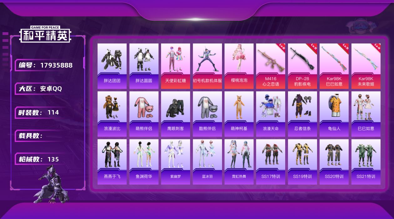 [17935888]【特价出售/店主推荐】安卓 手Q-3粉装-5特效枪-0载具-0粉色飞行器-39924热力值-9王牌印记-114套装-135枪皮