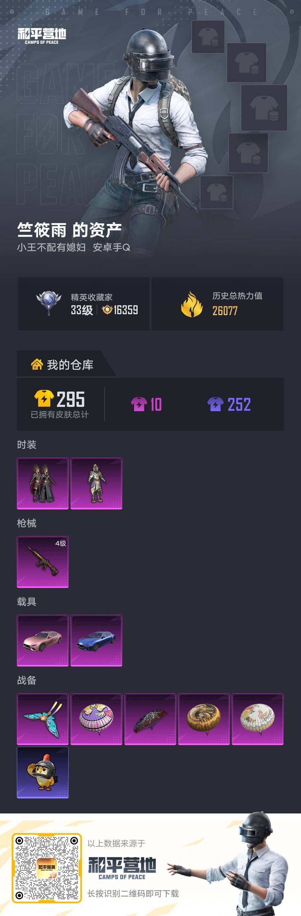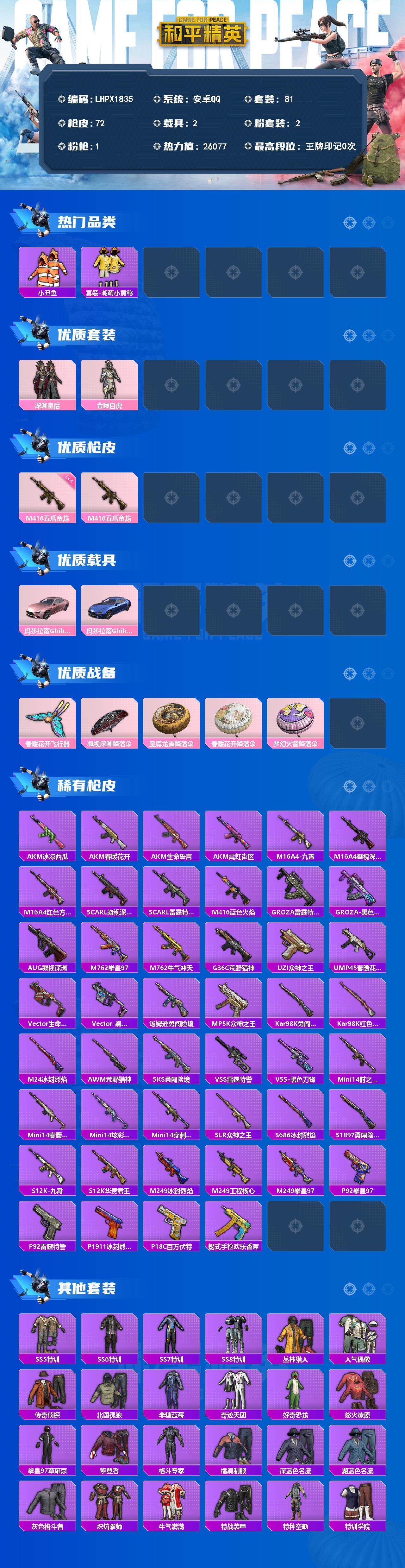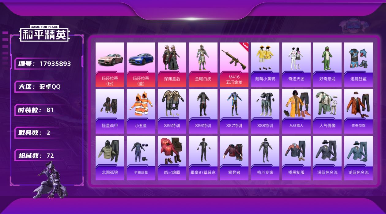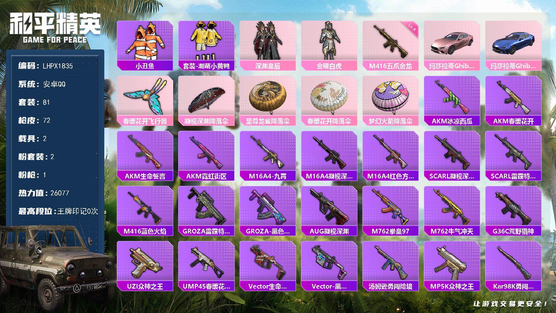 [17935893]可二次【特价出售/店主推荐】安卓 手Q-2粉装-1特效枪-2载具-1粉色飞行器-26077热力值-2王牌印记-81套装-72枪皮【热门品类】:套装-小丑鱼,套装-潮萌小黄鸭【粉色套装】:粉装-深渊皇后,粉装-金曜白虎【粉色枪皮等级】:M416-五爪金龙(四级)【粉色载具】:玛莎拉蒂Ghibli(粉),玛莎拉蒂Ghibli(蓝)【粉色枪皮】:M416-五爪金龙【粉色飞行器】:春暖花开飞行器