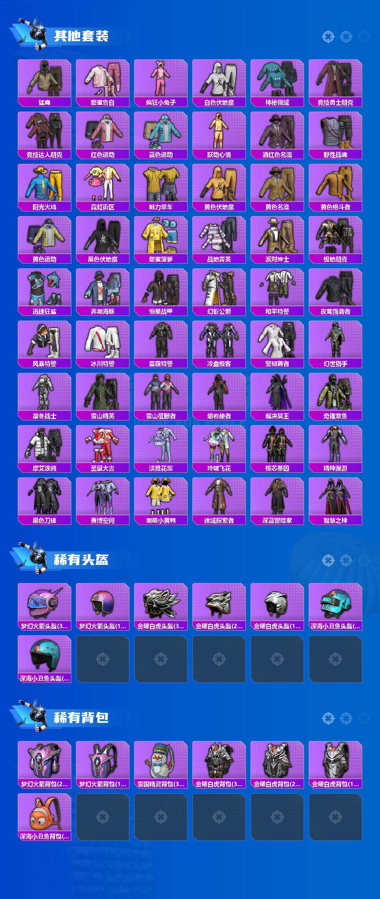 - [16329511]【特价出售/店主推荐】240m总资产-42201k哈伏币-60烽火等级-黑鹰-1战场等级-无军衔【干员外观】:红狼-电锯惊魂【近战皮肤】:近战-信条,近战-黑鹰【典藏外观】:腾龙突击步枪-气象感应【传说外观】:M4A1突击步枪-蚀金玫瑰,M7战斗步枪-怜悯,SG552突击步枪-运动员,SCAR-H战斗步枪-启航,AS Val突击步枪-地下交易,KC17突击步枪-电锯惊魂,P90冲锋枪-信条,SR-25射手步枪-信条【史诗外观】:G3战斗步枪-流沙送葬,AS Val突击步枪-百步穿杨,腾龙突击步枪-猎鳄行动,MP5冲锋枪-战术竞备,MP5冲锋枪-竞技风,Vector冲锋枪-猎鳄行动,Vector冲锋枪-百步穿杨,S12K霰弹枪-曙光,SVD狙击步枪-阿萨拉工艺,SV-98狙击步枪-猎鳄行动,M700狙击步枪-百步穿杨,AWM狙击步枪-流沙送葬,沙漠之鹰-曙光【稀有外观】:M4A1突击步枪-繁盛,AKM突击步枪-肃杀,ASh-12战斗步枪-繁盛,AUG突击步枪-指挥官,M7战斗步枪-捣蛋鬼,SCAR-H战斗步枪-荣耀列队,腾龙突击步枪-冰天雪地,K437突击步枪-生存指令,MK47突击步枪-精英联盟,MP5冲锋枪-弄臣,MP5冲锋枪-哈夫克卫队,P90冲锋枪-黄昏,P90冲锋枪-捣蛋鬼,Vector冲锋枪-先锋,UZI冲锋枪-前沿科技,UZI冲锋枪-亚特兰蒂斯,野牛冲锋枪-前沿科技,SMG-45-行动开启,勇士冲锋枪-主宰,勇士冲锋枪-冰天雪地,MP7冲锋枪-钢铁之躯,M1014霰弹枪-幻影结构,QJB201轻机枪-哈夫克卫队,Mini-14射手步枪-荣耀列队,SKS射手步枪-弄臣,SR-25射手步枪-开拓,PSG-1射手步枪-主宰,SV-98狙击步枪-星链科技,SV-98狙击步枪-哈夫克航天,SV-98狙击步枪-精英联盟,G18-星链科技,G18-哈夫克航天【普通外观】:M700狙击步枪-蝴蝶,腾龙突击步枪-古铜,S12K霰弹枪-古铜,VSS射手步枪-噬菌体,M4A1突击步枪-粉色涂装,M4A1突击步枪-高雅黑,M4A1突击步枪-海色,QBZ95-1突击步枪-三角洲力量,QBZ95-1突击步枪-海色,QBZ191突击步枪-三角洲力量,K416突击步枪-高雅黑,M16A4突击步枪-高雅黑,AUG突击步枪-浅蓝涂装,M7战斗步枪-红色涂装,SG552突击步枪-浅蓝涂装,