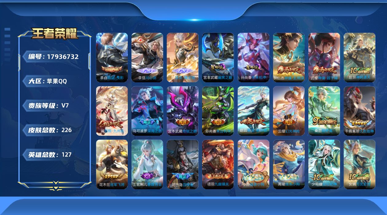 [17936732]【特价急出/详情看图】苹果Q-V7-至尊星耀II段位-127英雄-226皮肤-1典藏皮肤-2无双-2星元-12传说-69史诗