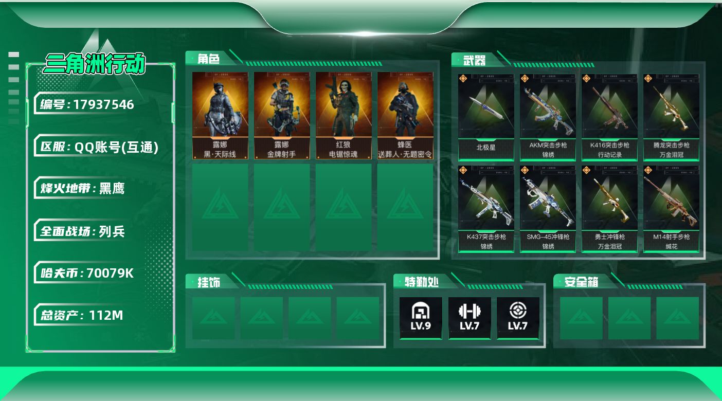 [17937546]112m总资产-70079k哈夫币-60烽火等级-黑鹰-11战场等级-列兵 【干员外观】:露娜-黑·天际线,蜂医-送葬人·无题密令,红狼-电锯惊魂,露娜-金牌射手 【近战皮肤】:近战-北极星,近战-黑鹰 【传说外观】:M4A1突击步枪-阿米娅,AKM突击步枪-锦绣,ASh-12战斗步枪-鹅鸭杀,K416突击步枪-行动记录,M7战斗步枪-零度协议,SG552突击步枪-运动员,AK-12突击步枪-特斯拉线圈,SCAR-H战斗步枪-启航,CAR-15突击步枪-阿米娅,腾龙突击步枪-捞点薯条,腾龙突击步枪-万金泪冠,K437突击步枪-北极星,K437突击步枪-锦绣,KC17突击步枪-电锯惊魂,UZI冲锋枪-特斯拉线圈,SMG-45冲锋枪-锦绣,SR-3M紧凑突击步枪-特斯拉线圈,勇士冲锋枪-能天使-午夜邮差,勇士冲锋枪-万金泪冠,QCQ171冲锋枪-北极星,QCQ171冲锋枪-鹅鸭杀,725双管霰弹枪-送葬人-无题密令,M250通用机枪-骑士之心,QJB201轻机枪-鹅鸭杀,M14射手步枪-缄花,SR-25射手步枪-缄花,AWM狙击步枪-捞点薯条,AWM狙击步枪-万金泪冠,.357左轮-缄花,93R-捞点薯条,复合弓-黑·天际线 【史诗外观】:P90冲锋枪-暗鸦,QBZ95-1突击步枪-曙光,ASh-12战斗步枪-无极限,K416突击步枪-冬日风情,K416突击步枪-阿萨拉特攻,M16A4突击步枪-竞赛选手,AUG突击步枪-蝮蛇,M7战斗步枪-百步穿杨,SG552突击步枪-深海恐惧,SG552突击步枪-哈夫克警备,SCAR-H战斗步枪-囚徒,G3战斗步枪-流沙送葬,G3战斗步枪-哈夫克警备,AS Val突击步枪-典狱官,AS Val突击步枪-百步穿杨,腾龙突击步枪-无垢,腾龙突击步枪-猎鳄行动,K437突击步枪-守护者,MP5冲锋枪-深海恐惧,MP5冲锋枪-战术竞备,MP5冲锋枪-竞技风,P90冲锋枪-紧急戒备,Vector冲锋枪-阿萨拉文明,Vector冲锋枪-猎鳄行动,Vector冲锋枪-百步穿杨,Vector冲锋枪-异域战争,SMG-45冲锋枪-阿萨拉特攻,SR-3M紧凑突击步枪-荒野求生,SR-3M紧凑突击步枪-战术竞备,勇士冲锋枪-深海恐惧,勇士冲锋枪-工业狂潮,MP7冲锋枪-无垢,MP7冲锋枪-守护者,PKM通用机枪-蝮蛇,PKM通用机枪-荒野求生,M250通