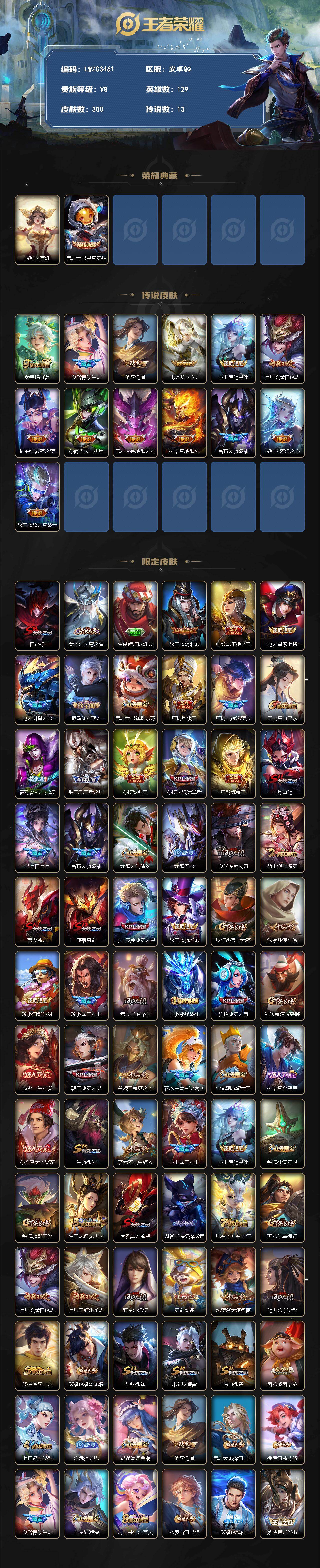 [17937598]安卓Q-V8-永恒钻石I段位-129英雄-300皮肤-1典藏皮肤-1典藏英雄-13传说-86史诗