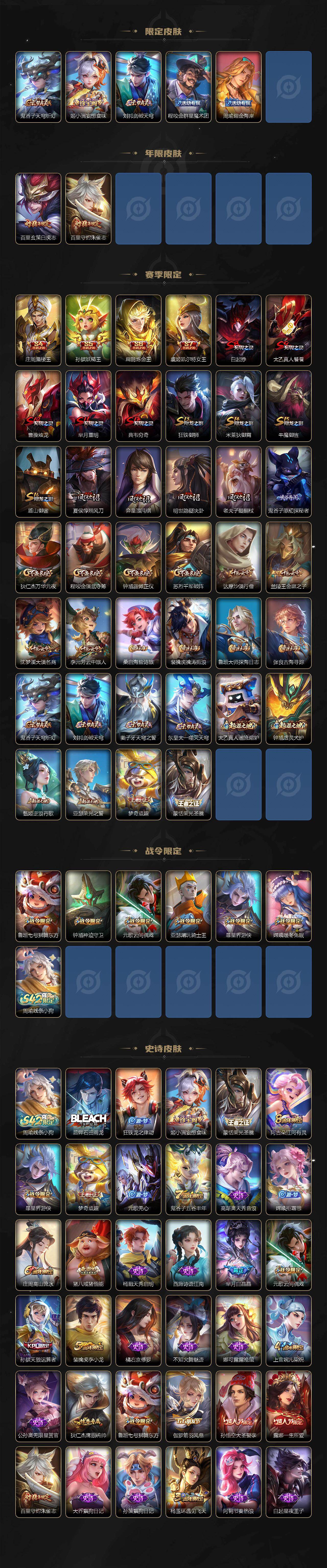 【赛季限定】:庄周蜃楼王,孙膑妖精王,扁鹊炼金王,虞姬凯尔特女王,白起狰,太乙真人饕餮,曹操烛龙,芈月重明,典韦穷奇,狂铁御狮,米莱狄御霄,牛魔御旌,盾山御銮,夏侯惇朔风刀,弈星混沌棋,明世隐疑决卦,老夫子醍醐杖,鬼谷子原初探秘者,狄仁杰万华元夜,程咬金演武夺筹,钟馗驱傩正仪,苏烈千军破阵,达摩沙漠行僧,兰陵王金庭之子,沈梦溪大漠名商,李元芳云中旅人,桑启海盐诗旅,裴擒虎擒涛扼浪,鲁班大师探海日志,张良古海寻踪,鬼