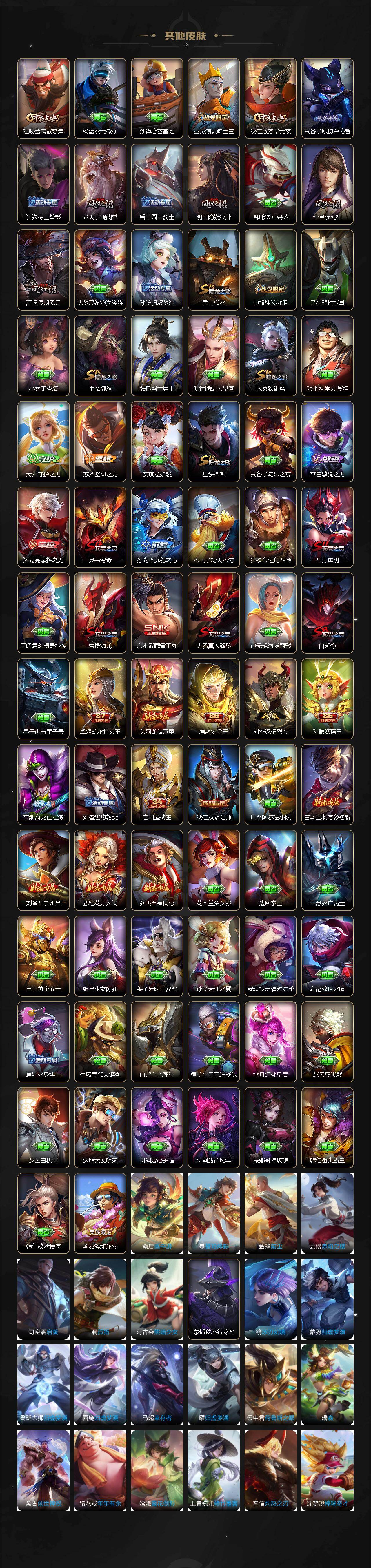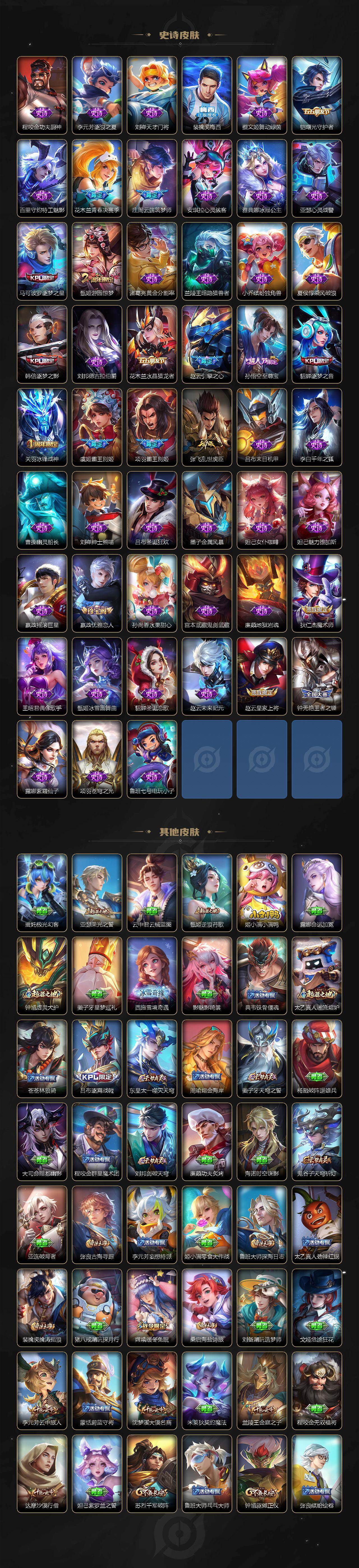 【限定皮肤】:白起狰,姜子牙天穹之誓,杨戬破阵退雄兵,狄仁杰阴阳师,虞姬凯尔特女王,赵云皇家上将,赵云引擎之心,嬴政优雅恋人,鲁班七号狮舞东方,庄周蜃楼王,庄周云端筑梦师,庄周高山流水,高渐离死亡摇滚,钟无艳王者之锤,孙膑妖精王,孙膑天狼运算者,扁鹊炼金王,芈月重明,芈月白晶晶,吕布天魔缭乱,元歌云间偶戏,元歌无心,夏侯惇朔风刀,甄姬游园惊梦,曹操烛龙,典韦穷奇,马可波罗逐梦之星,狄仁杰魔术师,狄仁杰万华元夜,达摩沙漠行僧,项羽海滩派对,项羽霸王别姬,老夫子醍醐杖,关羽冰锋战神,貂蝉逐梦之音,程咬金演武夺筹,露娜一生所爱,韩信逐梦之影,兰陵王金庭之子,花木兰青春决赛季,亚瑟潮玩骑士王,孙悟空至尊宝,孙悟空大圣娶亲,牛魔御旌,李元芳云中旅人,虞姬霸王别姬,虞姬启明星使,钟馗神迹守卫,钟馗驱傩正仪,杨玉环遇见飞天,太乙真人饕餮,鬼谷子原初探秘者,鬼谷子五谷丰年,苏烈千军破阵,百里玄策白虎志,百里守约朱雀志,弈星混沌棋,梦奇顽趣,沈梦溪大漠名商,明世隐疑决卦,裴擒虎李小龙,裴擒虎擒涛扼浪,狂铁御狮,米莱狄御霄,盾山御銮,猪八戒猪悟能,上官婉儿梁祝,嫦娥拒霜思,嫦娥暖冬兔眠,曜李逍遥 ,鲁班大师探海日志,桑启海盐诗旅,夏洛特浮生妄,暃星界游侠,阿古朵江河有灵,张良古海寻踪,裴擒虎梅西,蒙恬荣光圣徽,鬼谷子天穹祈灯,姬小满妄想食味,刘邦剑破天穹,程咬金群星魔术团,周瑜熔金海岸