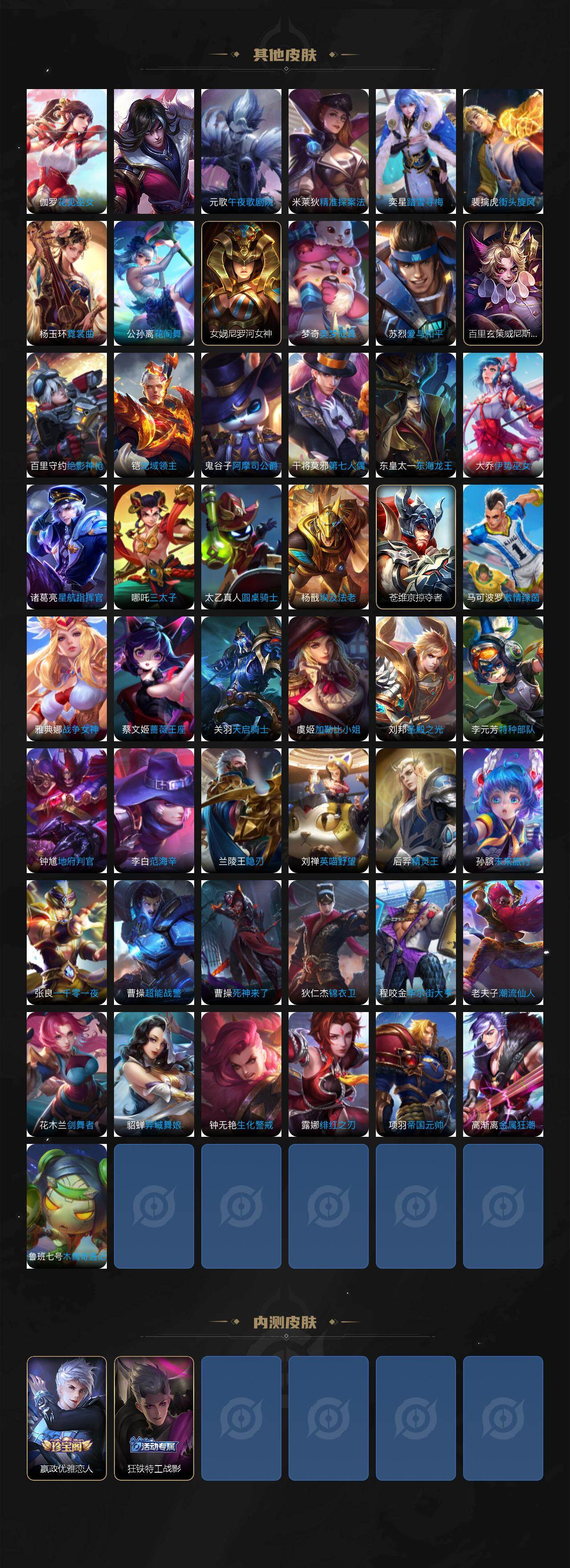 庄周蜃楼王,孙膑妖精王,扁鹊炼金王,虞姬凯尔特女王,白起狰,太乙真人饕餮,曹操烛龙,芈月重明,典韦穷奇,狂铁御狮,米莱狄御霄,牛魔御旌,盾山御銮,夏侯惇朔风刀,明世隐疑决卦,老夫子醍醐杖,鬼谷子原初探秘者,狄仁杰万华元夜,程咬金演武夺筹,钟馗驱傩正仪,苏烈千军破阵,钟馗神迹守卫,鲁班七号狮舞东方,元歌云间偶戏,弈星混沌棋,达摩沙漠行僧,兰陵王金庭之子,沈梦溪大漠名商,李元芳云中旅人,桑启海盐诗旅,裴擒虎擒涛扼浪,鲁班大师探海日志,张良古海寻踪