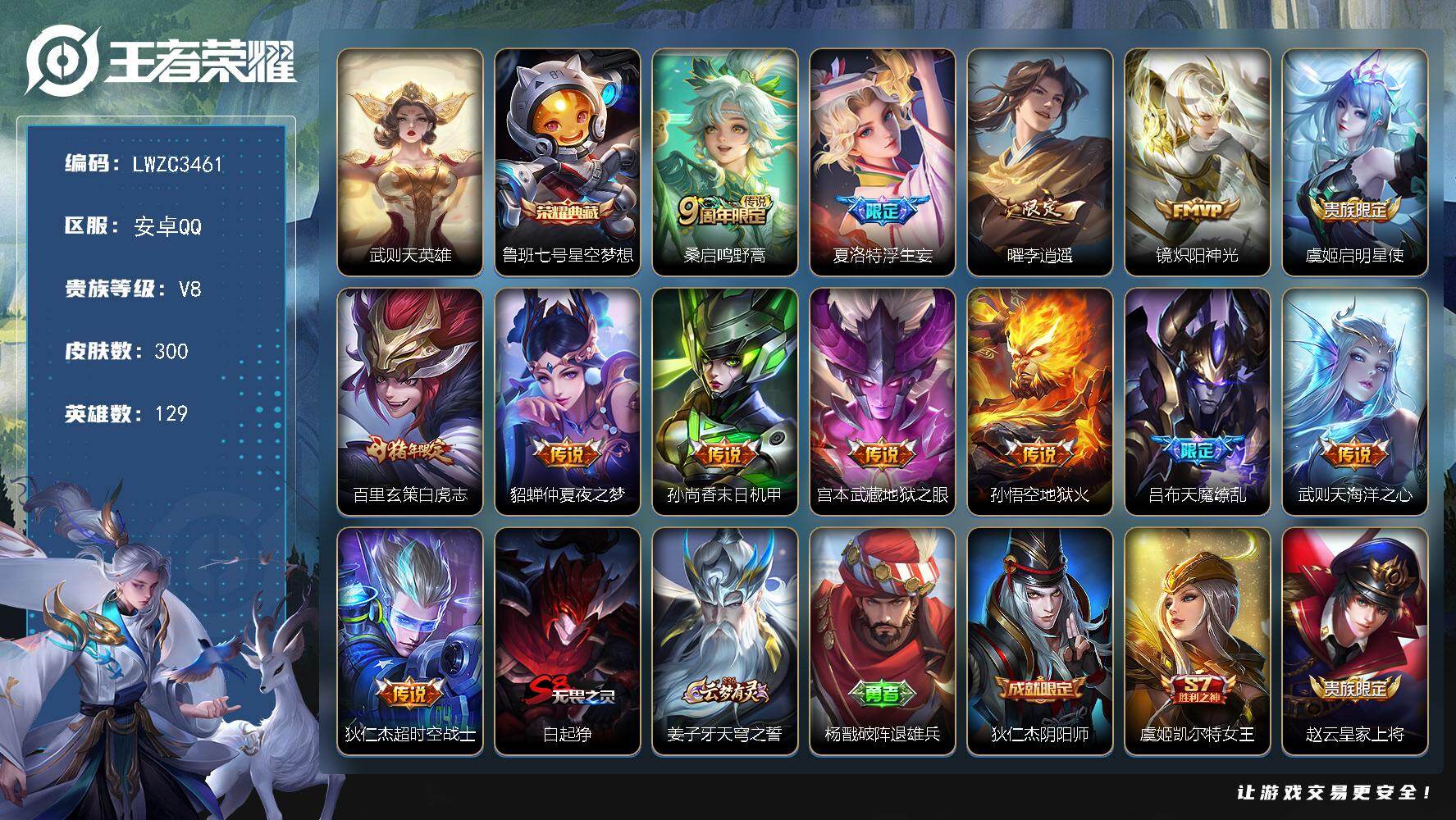 [17937598]安卓Q-V8-永恒钻石I段位-129英雄-300皮肤-1典藏皮肤-1典藏英雄-13传说-86史诗 【荣耀典藏】:武则天英雄,鲁班七号星空梦想 【传说皮肤】:桑启鸣野蒿,夏洛特浮生妄,曜李逍遥 ,镜炽阳神光,虞姬启明星使,百里玄策白虎志,貂蝉仲夏夜之梦,孙尚香末日机甲,宫本武藏地狱之眼,孙悟空地狱火,吕布天魔缭乱,武则天海洋之心,狄仁杰超时空战士 【限定皮肤】:白起狰,姜子牙天穹之誓,杨戬破阵退雄兵,狄仁杰阴阳师,虞姬凯尔特女王,赵云皇家上将,赵云引擎之心,嬴政优雅恋人,鲁班七号狮舞东方,庄周蜃楼王,庄周云端筑梦师,庄周高山流水,高渐离死亡摇滚,钟无艳王者之锤,孙膑妖精王,孙膑天狼运算者,扁鹊炼金王,芈月重明,芈月白晶晶,吕布天魔缭乱,元歌云间偶戏,元歌无心,夏侯惇朔风刀,甄姬游园惊梦,曹操烛龙,典韦穷奇,马可波罗逐梦之星,狄仁杰魔术师,狄仁杰万华元夜,达摩沙漠行僧,项羽海滩派对,项羽霸王别姬,老夫子醍醐杖,关羽冰锋战神,貂蝉逐梦之音,程咬金演武夺筹,露娜一生所爱,韩信逐梦之影,兰陵王金庭之子,花木兰青春决赛季,亚瑟潮玩骑士王,孙悟空至尊宝,孙悟空大圣娶亲,牛魔御旌,李元芳云中旅人,虞姬霸王别姬,虞姬启明星使,钟馗神迹守卫,钟馗驱傩正仪,杨玉环遇见飞天,太乙真人饕餮,鬼谷子原初探秘者,鬼谷子五谷丰年,苏烈千军破阵,百里玄策白虎志,百里守约朱雀志,弈星混沌棋,梦奇顽趣,沈梦溪大漠名商,明世隐疑决卦,裴擒虎李小龙,裴擒虎擒涛扼浪,狂铁御狮,米莱狄御霄,盾山御銮,猪八戒猪悟能,上官婉儿梁祝,嫦娥拒霜思,嫦娥暖冬兔眠,曜李逍遥 ,鲁班大师探海日志,桑启海盐诗旅,夏洛特浮生妄,暃星界游侠,阿古朵江河有灵,张良古海寻踪,裴擒虎梅西,蒙恬荣光圣徽,鬼谷子天穹祈灯,姬小满妄想食味,刘邦剑破天穹,程咬金群星魔术团,周瑜熔金海岸 【年限皮肤】:百里玄策白虎志,百里守约朱雀志 【赛季限定】:庄周蜃楼王,孙膑妖精王,扁鹊炼金王,虞姬凯尔特女王,白起狰,太乙真人饕餮,曹操烛龙,芈月重明,典韦穷奇,狂铁御狮,米莱狄御霄,牛魔御旌,盾山御銮,夏侯惇朔风刀,弈星混沌棋,明世隐疑决卦,老夫子醍醐杖,鬼谷子原初探秘者,狄仁杰万华元夜,程咬金演武夺筹,钟馗驱傩正仪,苏烈千军破阵,达摩沙漠行僧,兰陵王金庭之子,沈梦溪大漠名商,李元芳云中旅人,桑启海盐诗旅,裴擒虎擒涛扼浪,鲁班大师探海日志,张良古海寻踪,鬼