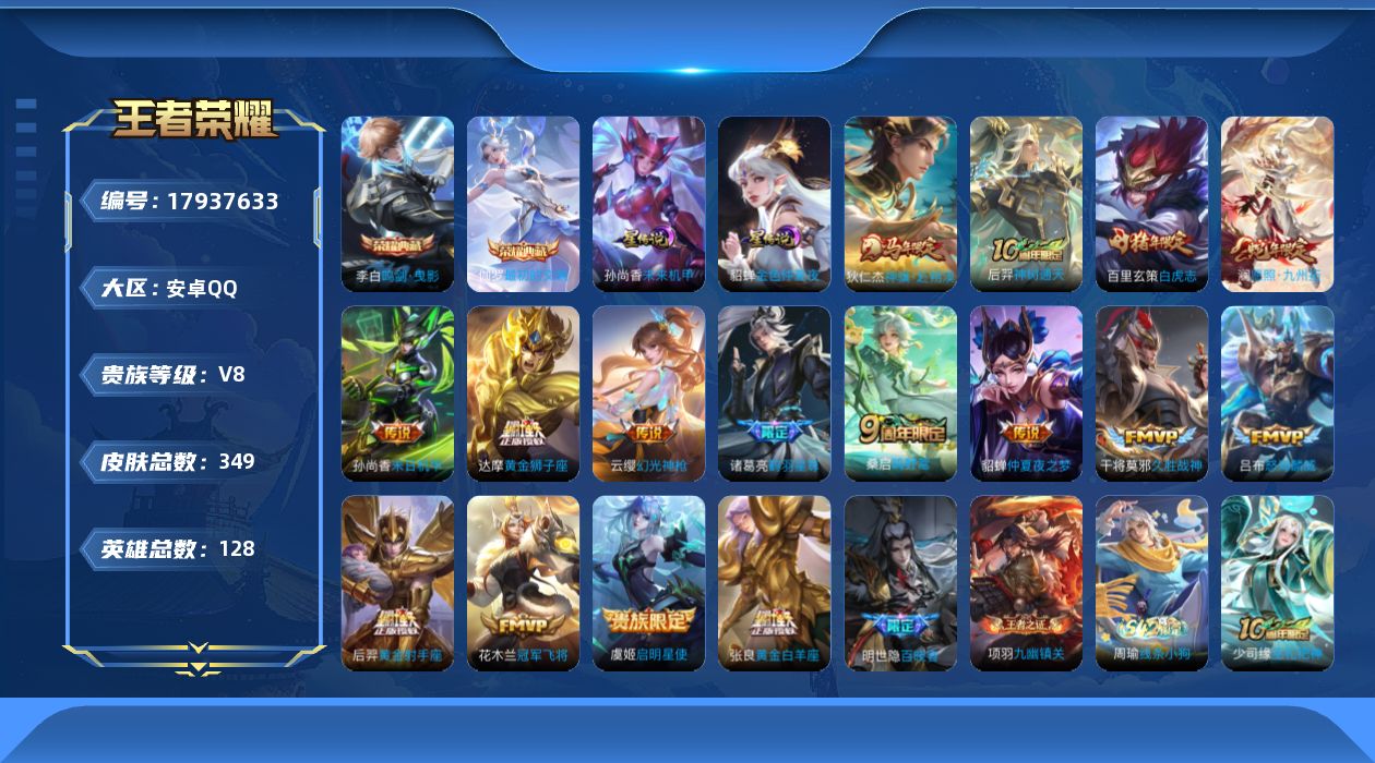 - [12108750]V8 1典藏 1无双 25传说 125英雄 260皮肤 可修改实名 优质装备:九霄神辉(木兰典藏),韩信群星魔术团(韩信无双),一念神魔,云霓雀翎,地狱火,仲夏夜之梦(大飞蛾),地狱之眼,音你心动-周瑜,乞巧织情,时之恋人-刘备(电焊工),淬星耀世,超时空战士-狄仁杰,无双飞将,山海·苍雷引(电光曜子),炽翼辉光(娃娃菜牛角包),霜月吟,涂山容容 传说皮:死亡执政官,幻光神枪 珍宝阁皮:万物之道,优雅恋人,蔷薇恋人 限定皮:愿照·岁时盈(虞姬年限),愿照·众生和(妲己年限),鸣野蒿,白虎志(电光耗子),绯月行,飞衡(韩信年限),诗剑行,怒海麟威,五谷丰年,梁祝,祈雪灵祝(雪兔子),李小龙,朱雀志(守约年限),大圣娶亲,冰霜恋舞曲,匿光追影者,唐三藏,山海·玄木吟(马可年限) 史诗皮:星界战将,龙之律动,怒海争锋,蒙犽顽岩魄,芈月浮光幕影,决胜骁骑,百相守梦-百里守约,百相守梦-黄忠,紫霞仙子,电玩小子(小书包),白龙吟,黄金分割率,千年之狐,百解令(蒙犽),蒙恬荣光圣徽,青蛇,晚萤,电玩·爆裂旋风,暗夜猫娘,龙骑士(小龙虾),猫狗日记-大乔,时之恋人-孙尚香,节奏热浪,修罗,女仆咖啡,摇滚巨星,水果甜心,绅士熊喵,天才门将,时之奇旅-安琪拉,功夫厨神,德古拉伯爵,暗隐猎兽者,幽灵船长,鬼剑武藏,心灵战警,天秀·启明,舞动绿茵,地狱岩魂,纤云弄巧,繁星吟游(呼啦呼啦),拒霜思,缤纷独角兽,乘风破浪,逐浪之夏,龙鼓争鸣,月团寄思,水晶猎龙者,曙光守护者,金属风暴,原初追逐者,圣诞狂欢,圣诞恋歌,鹰眼统帅,魅力维加斯,黎明之约,赏金猎手,无心,未来纪元-赵云