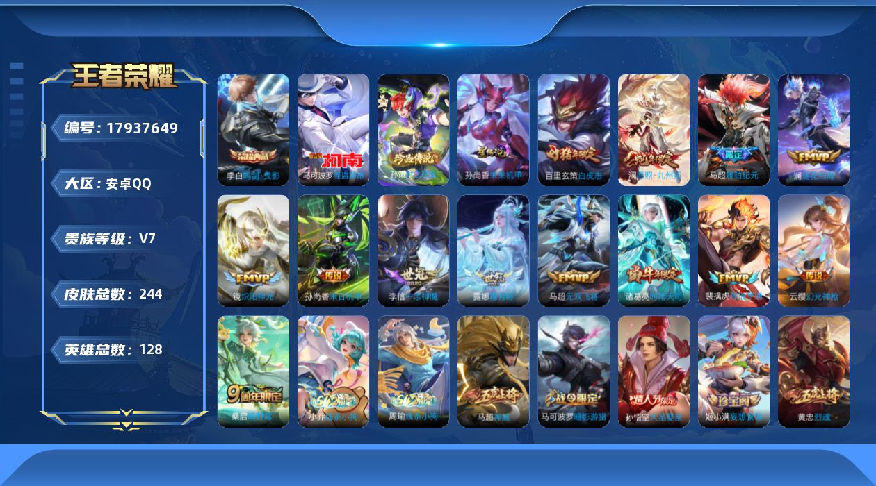 [17937649]可二次【特价出售/店主推荐/5市标/30段打野/】:安卓Q-V7-最强王者段位-128英雄-244皮肤-1典藏皮肤-1星元-2珍品传说-13传说-55史诗