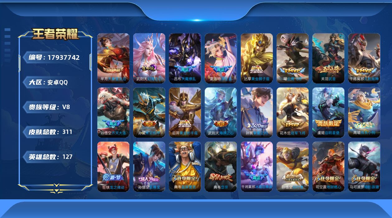 [17937742]【特价急出/详情看图】安卓Q-V8-至尊星耀II段位-127英雄-311皮肤-1典藏皮肤-1典藏英雄-1星元-13传说-89史诗
