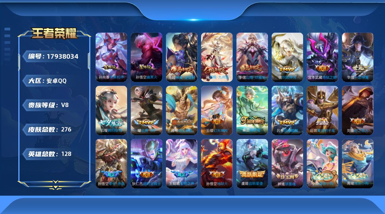 [17938034]【特价急出/详情看图】安卓Q-V8-最强王者段位-128英雄-276皮肤-2星元-19传说-79史诗