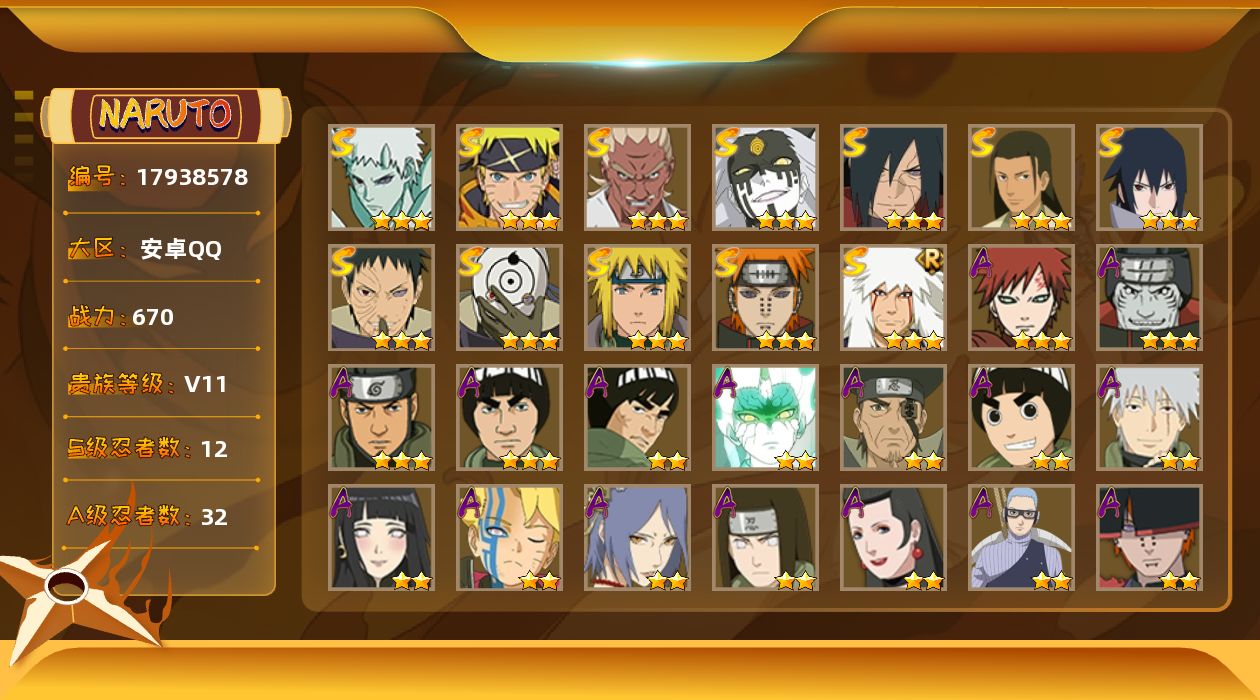 [17938578]12S级忍者数-32A级忍者数 【S级忍者】:宇智波斑「秽土转生·解」(3星),宇智波带土「忍界大战」(3星),艾「忍界大战」(3星),千手柱间「木叶创立」(3星),自来也「舞之豪杰」(3星),波风水门(3星),佩恩「天道」(3星),宇智波佐助「永恒万花筒」(3星),宇智波斑 「白面具」(3星宇智波斑「白面具」),大筒木桃式(3星),漩涡鸣人·宇智波佐助(3星),宇智波带土「十尾人柱力」(3星) 【A级忍者】:波风水门「青年」(2星),波风水门「新春限定」(2星),迪达拉(2星),迪达拉「秽土转生」(2星),飞段(2星),飞段「死司凭血」(2星),干柿鬼鲛(3星),漩涡博人「桃式显现」(2星),迈特凯(3星),旗木卡卡西「幻之真容」(2星),我爱罗「疾风传」(3星),蝎(2星),小南「漂泊浪客」(2星),小南「神驹佑将」(2星),猿飞阿斯玛(3星),宇智波止水「新春限定」(2星),宇智波鼬(2星),宇智波佐助「须佐能乎」(2星),日向宁次「忍界大战」(2星),日向雏田「最终章」(2星),长十郎「六代目水影」(2星),卑留呼「火之意志继承者」(2星),神秘面具男「忍者之路」(2星),佩恩·六道「漂泊浪客」(2星),李洛克「忍界大战」(2星),黑土「博人传」(2星),千手扉间「漂泊武士」(2星),秋道丁次「忍界大战」(2星),土台「忍界大战」(2星),不缘(2星),巳月「仙人模式」(2星),迈特凯「青春爆炸」(2星)