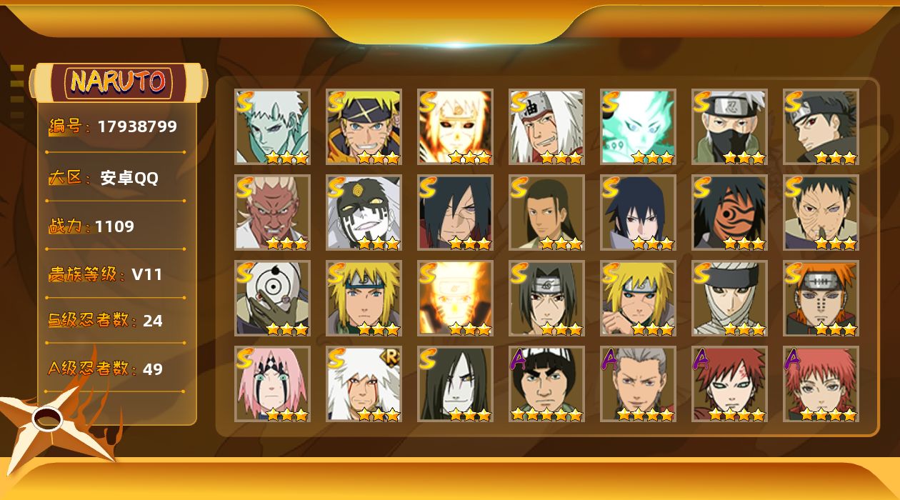 【S级忍者】:波风水门「秽土转生」(3星),宇智波斑「秽土转生·解」(3星),春野樱「忍界大战」(3星),宇智波带土「忍界大战」(3星),艾「忍界大战」(3星),宇智波鼬「须佐能乎」(3星),宇智波止水「须佐能乎」(3星),旗木卡卡西「须佐能乎」(3星),千手柱间「木叶创立」(3星),无「二代目土影」(3星),自来也「舞之豪杰」(3星),大蛇丸(3星),自来也「传说中的三忍」(3星),波风水门(3星),神秘面具男「红夜之刃」(3星),漩涡鸣人「九喇嘛连结」(3星),佩恩「天道」(3星),宇智波佐助「永恒万花筒」(3星),宇智波斑 「白面具」(3星宇智波斑「白面具」),大筒木桃式(3星),大筒木舍人「最终章」(3星),波风水门「九喇嘛连结」(3星),漩涡鸣人·宇智波佐助(3星),宇智波带土「十尾人柱力」(3星)