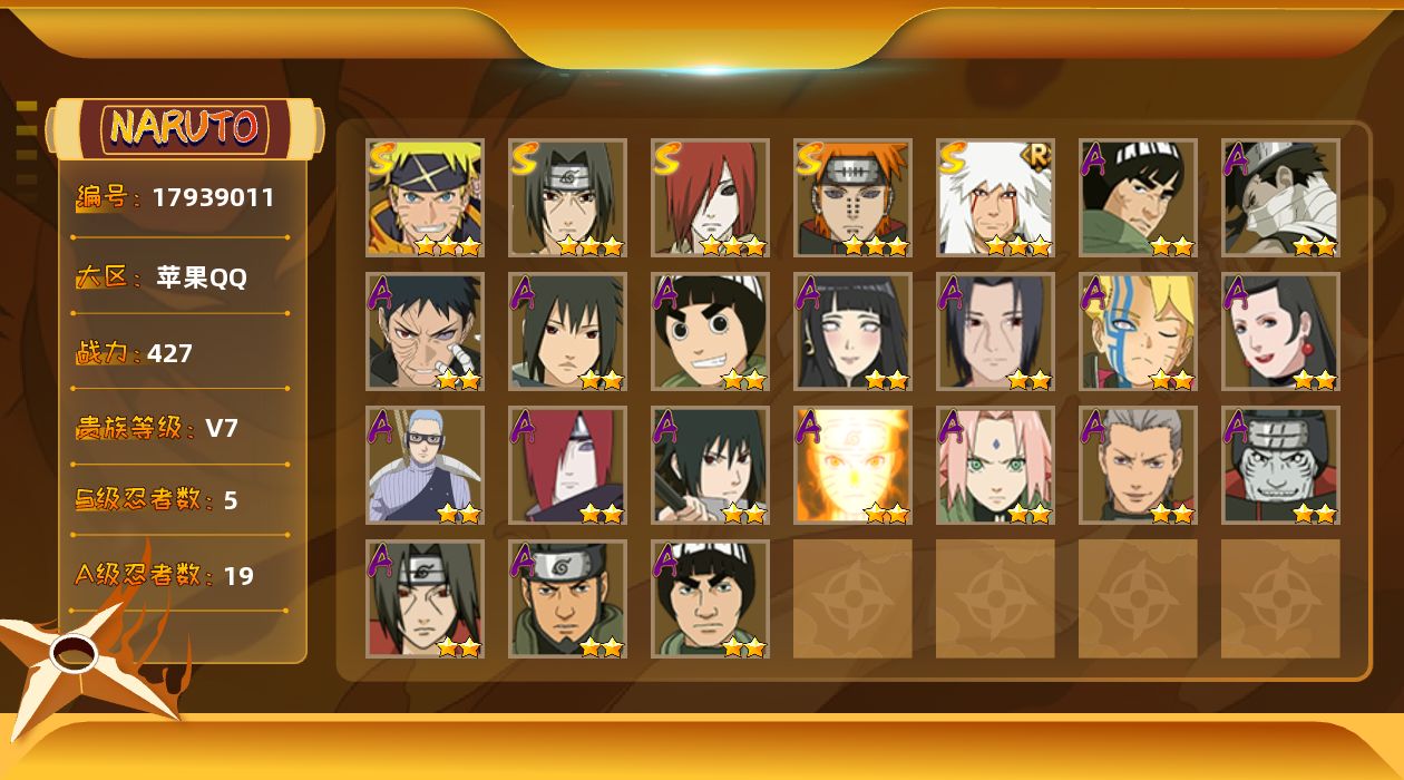 【S级忍者】:长门「秽土转生」(3星),宇智波鼬「须佐能乎」(3星),自来也「舞之豪杰」(3星),佩恩「天道」(3星),漩涡鸣人·宇智波佐助(3星)