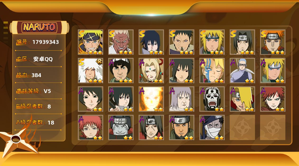 【S级忍者】:宇智波带土「忍界大战」(3星),艾「忍界大战」(3星),宇智波鼬「须佐能乎」(3星),自来也「舞之豪杰」(3星),波风水门(3星),佩恩「天道」(3星),宇智波佐助「永恒万花筒」(3星),漩涡鸣人·宇智波佐助(3星)