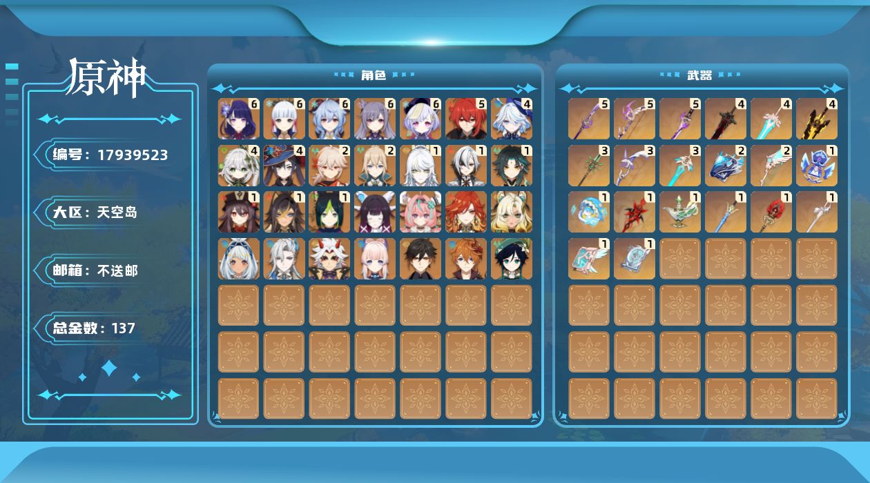 1命阿蕾奇诺,4命芙宁娜,0命那维莱特,1命迪希雅,4命纳西妲,1命提纳里,0命荒泷一斗,满命雷电将军,2命枫原万叶,满命神里绫华,0命钟离,1命胡桃,满命甘雨,1命魈,0命温迪,0命达达利亚,0命珊瑚宫心海,满命刻晴,满命七七,2命琴,4命莫娜,5命迪卢克,0命希诺宁,0命玛拉妮,0命玛薇卡,0命瓦雷莎,0命哥伦比娅,1命兹白,精1赤月之形,精2万世流涌大典,精1千夜浮梦,精5薙草之稻光,精5飞雷之弦振,精5雾切之回光,精1苍古自由之誓,精4无工之剑,精1护摩之杖,精1四风原典,精3和璞鸢,精2天空之翼,精3阿莫斯之弓,精3天空之刃,精1天空之卷,精1风鹰剑,精4狼的末路,精4天空之傲,精1冲浪时光,精1祭星者之望