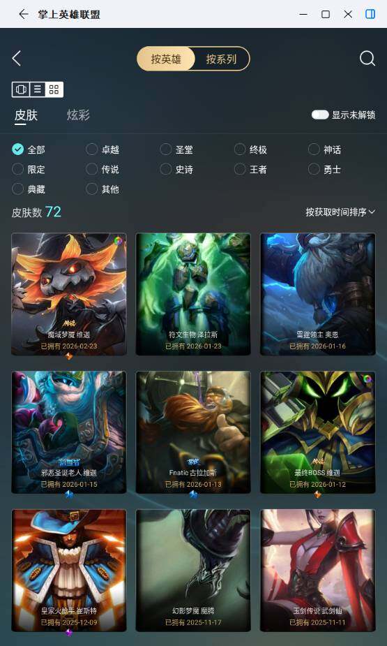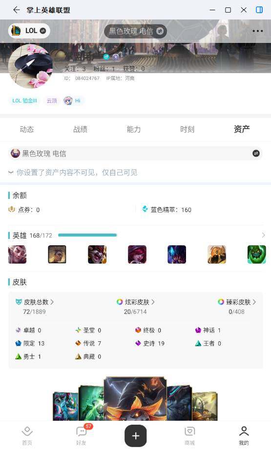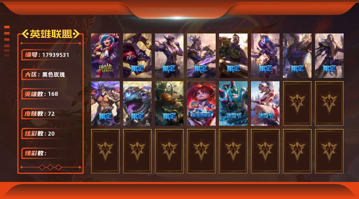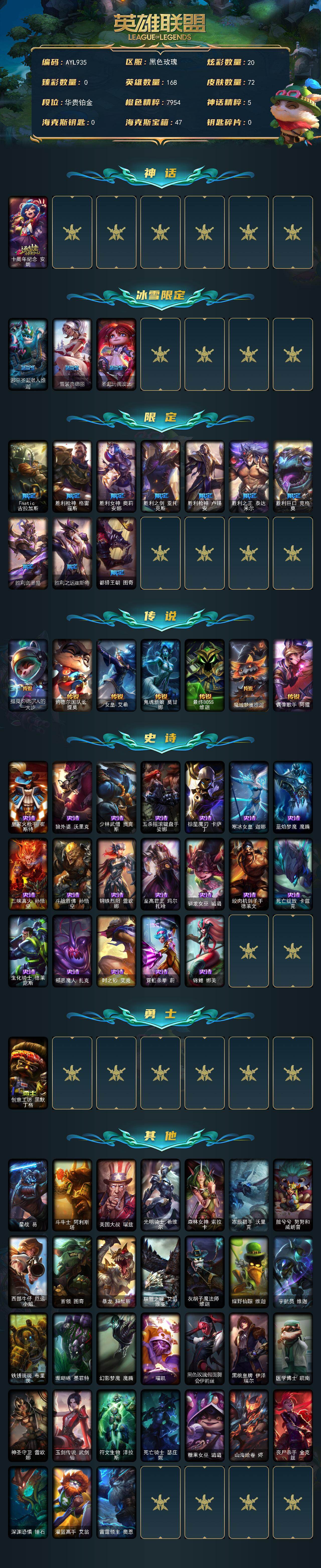 [17939531]铂金段位-168英雄-72皮肤-20炫彩-0终极-1神话-13限定-7传说-19史诗