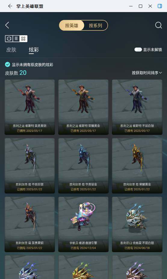 【史诗皮肤】:皇家火枪手崔斯特,狼外婆沃里克,少林武僧贾克斯,五杀摇滚键盘手娑娜,掠星魔刃卡萨丁,寒冰女皇迦娜,蓝焰梦魔魔腾,三昧真火孙悟空,斗战胜佛孙悟空,钢铁烈阳蕾欧娜,至高君王玛尔扎哈,驯龙女巫璐璐,绞肉机刽子手德莱文,死亡绽放卡兹克,生化骑士德莱厄斯,邪恶魔人扎克,时之砂艾克,霓虹杀拳蔚,锦鲤娜美