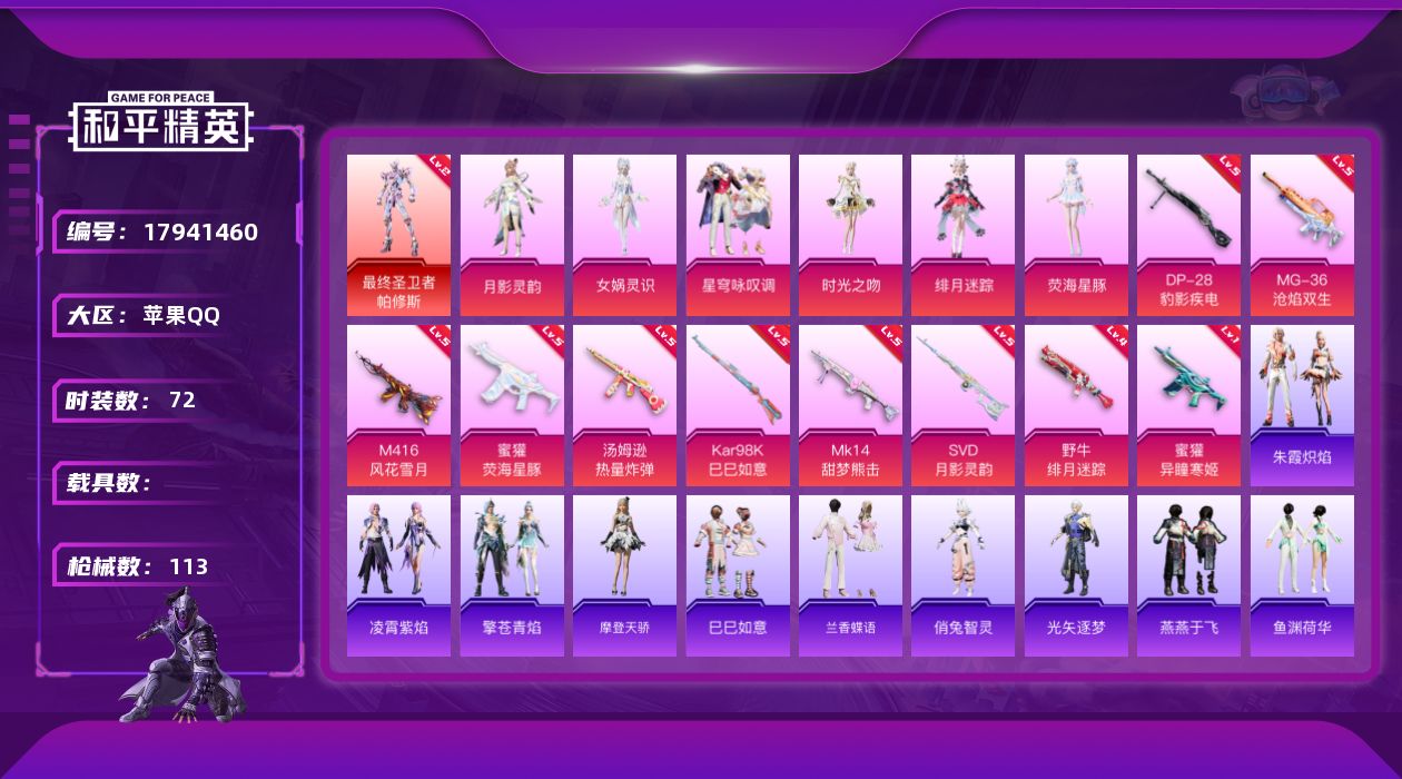 [17941460]苹果 手Q-1神装-8粉装-11特效枪-0载具-6粉色飞行器-39118热力值-5王牌印记-72套装-113枪皮【红色神装等级】:最终圣卫者-帕修斯(二级)【红色角色神装】:最终圣卫者-帕修斯【粉色套装】:角色-月影灵韵,角色-女娲灵识,粉装-星穹咏叹调,角色-时光之吻,角色-绯月迷踪,角色-荧海星豚,角色-虎痴许褚【粉色枪皮等级】:M416-风花雪月(五级),蜜獾-荧海星豚(五级),蜜獾-异瞳寒姬(一级),汤姆逊-热量炸弹(五级),野牛-绯月迷踪(四级),Kar98K-巳巳如意(五级),Mk14-甜梦熊击(五级),SVD-月影灵韵(五级),AA12-G-萌骑幻想(二级),DP-28-豹影疾电(五级),MG-36-沧焰双生(五级)【粉色枪皮】:M416-风花雪月,蜜獾-荧海星豚,蜜獾-异瞳寒姬,汤姆逊-热量炸弹,野牛-绯月迷踪,Kar98K-巳巳如意,Mk14-甜梦熊击,SVD-月影灵韵,AA12-G-萌骑幻想,DP-28-豹影疾电,MG-36-沧焰双生【粉色飞行器】:墨金战记飞行器,幻星舰长飞行器,时光之吻飞行器,终晖之翼飞行器,绯月迷踪飞行器,宁雨蝶飞行器