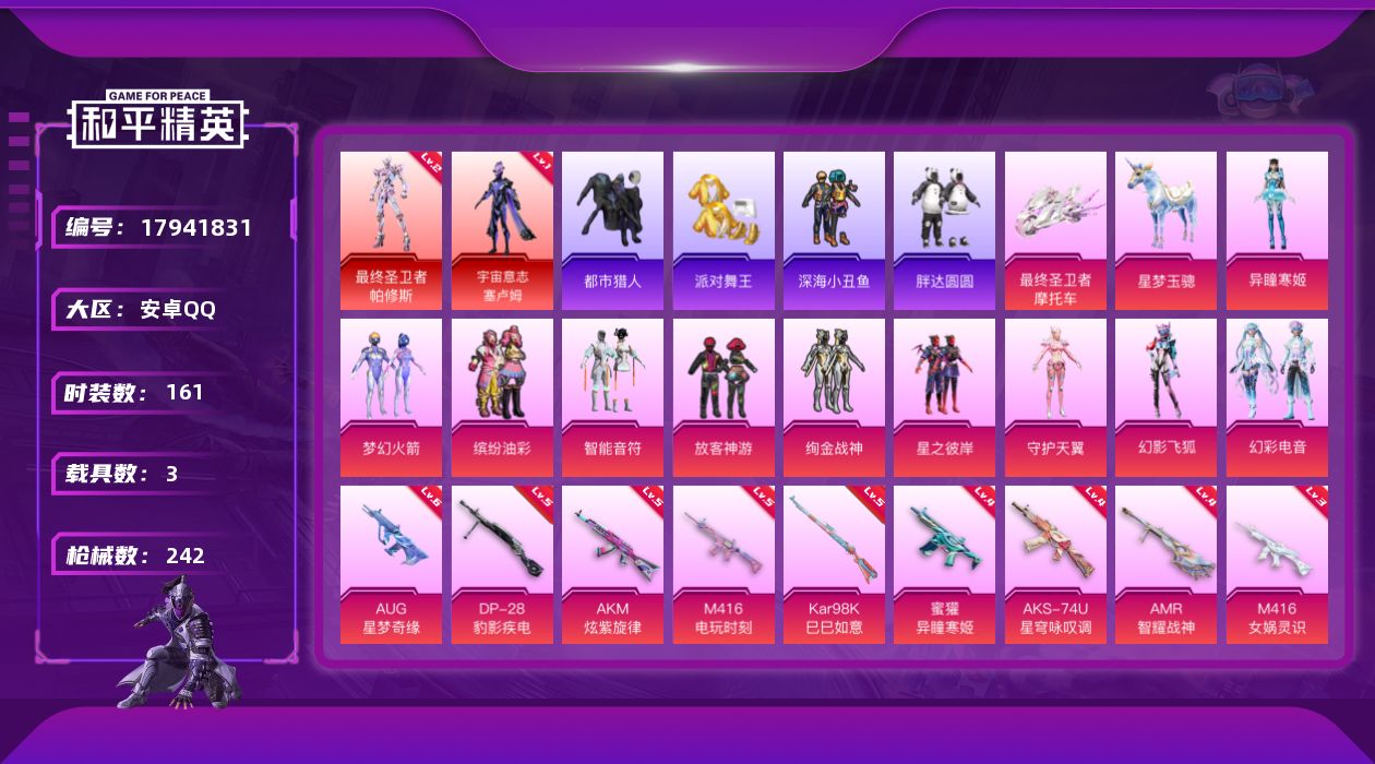 [17941831]安卓 手Q-3神装-11粉装-13特效枪-3载具-9粉色飞行器-87037热力值-8王牌印记-161套装-242枪皮