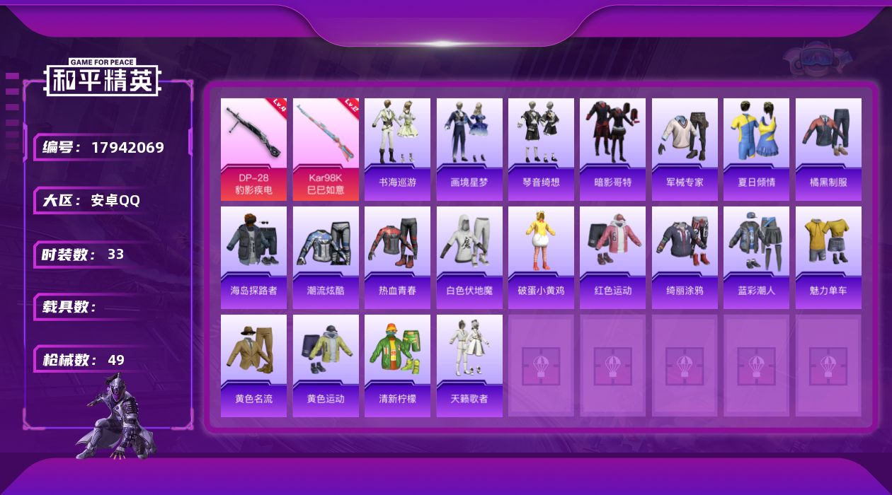 [17942069]安卓 手Q-0粉装-5特效枪-0载具-0粉色飞行器-10979热力值-1王牌印记-33套装-49枪皮