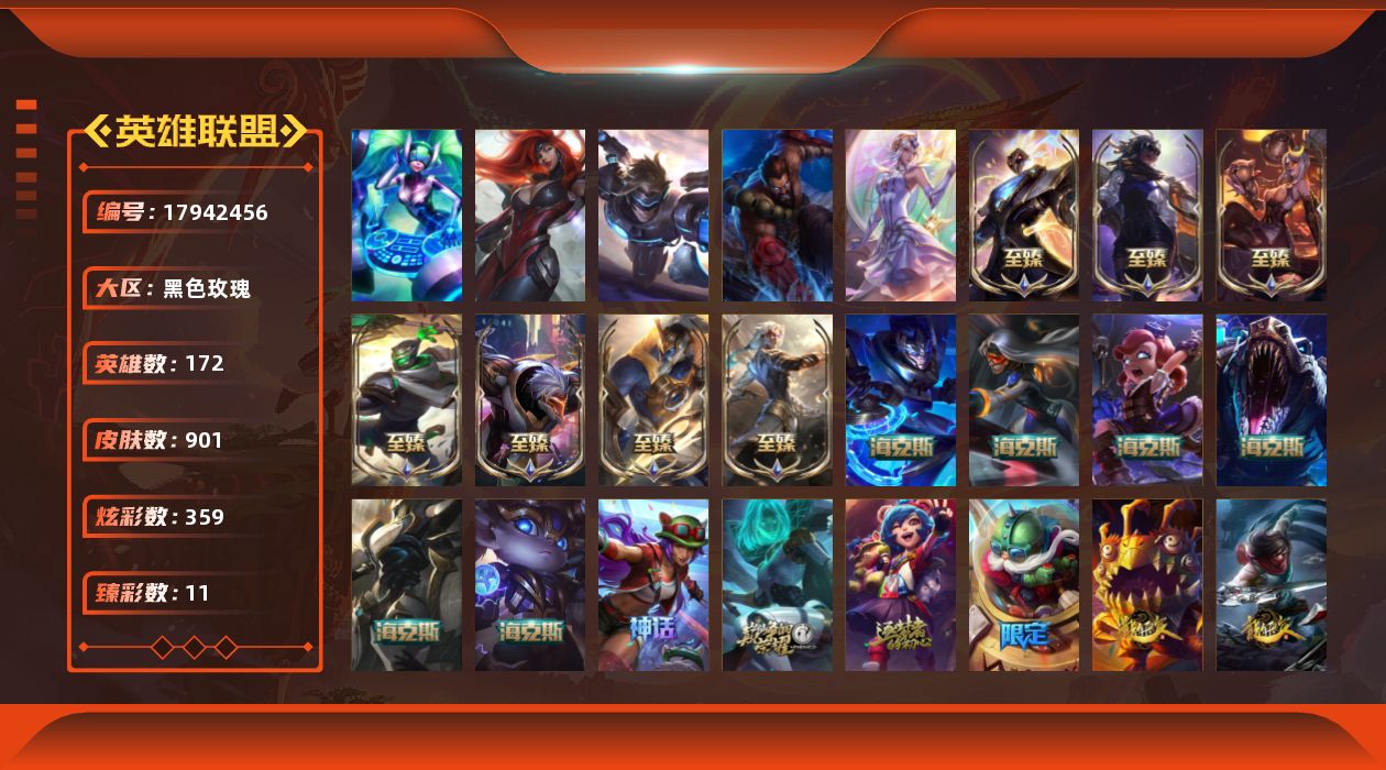 [17942456]【店主推荐捡漏号】未定级段位-172英雄-901皮肤-359炫彩-5终极-17神话-159限定-87传说-210史诗 【神话皮肤】:十周年纪念安妮,源代码乐芙兰,十五周年纪念希维尔,神凰行者瑞羽圣凰艾尼维亚,海克斯科技安妮,海克斯科技波比,海克斯科技嘉文四世,海克斯科技雷克顿,零之枪骑赫卡里姆,新创战纪希维尔,至臻征服者贾克斯,至臻真实伤害赛娜,至臻飞升战神潘森,至臻黑夜使者凯隐,至臻烈焰美人薇恩,至臻未来战士锤石,至臻源计划阴劫 【珍稀头像】:雪花头像 【热门头像】:觅心之翼奎因头像,觅心游侠卢锡安头像,银河魔装机神安妮头像 【至臻皮肤】:至臻征服者贾克斯,至臻烈焰美人薇恩,至臻飞升战神潘森,至臻黑夜使者凯隐,至臻真实伤害赛娜,至臻源计划阴劫,至臻未来战士锤石 【臻彩皮肤】:银龙裁决泰隆夜中血影,冠军掠夺者卡兹克凯旋圣装,冠军之血希瓦娜凯旋圣装,冠军之隐劫凯旋圣装,雾雨之刃锐雯,神龙尊者圣龙李青龙腾云起,弹幕天使卡莎炽天使公正,山海绘卷科加斯朱红,红莲之刃锐雯,王国机神白虎贾克斯云霄 【年限皮肤】:银龙裁决泰隆,定海神珍孙悟空,醒狮克格莫,你看见过我的熊猫吗安妮,神龙之翼库奇,替父从军花木兰,广寒仙子嫦娥,神龙烈焰金克丝,美猴王孙悟空,玉净夜叉凯特琳,张辽文远,司马懿仲达,虎痴之拳蔚,南天之怒沃里克,北辰之威内瑟斯,春晖神女拉克丝,烈焰美人薇恩,纳财大帝塔姆,王国机神苍狼瑟提,王国机神白虎贾克斯,王国机神玄武盖伦 【海克斯皮肤】:海克斯科技安妮,新创战纪希维尔,海克斯科技雷克顿,海克斯科技嘉文四世,海克斯科技波比,零之枪骑赫卡里姆 【情人节限定】:穿心之剑菲奥娜,觅心猎手薇恩 【冰雪限定】:幸福女神乐芙兰,冰雪风暴希维尔,圣诞开心鬼提莫,圣诞精灵崔丝塔娜,圣诞狂欢努努和威朗普,圣诞糖果棒厄运小姐,圣诞狂欢基兰,狂心冰王图奇,阿木木“主人不要我了”,胡桃夹子萨科,冰封王子蒙多,平安夜女神娑娜,英勇玩具兵普朗克,邪恶圣诞老人维迦,夺命美人卡特琳娜,喜庆之树茂凯,冬季仙境奥莉安娜,雪默丁格,圣诞玩偶波比,圣诞老人古拉加斯,圣诞驯鹿克格莫,魄罗骑士瑟庄妮,雪球也能爆炸吉格斯,寒冬精灵璐璐,冰雪节辛吉德,冰雪节玛尔扎哈,冰雪节格雷福斯,冰雪女神辛德拉,冰雪兽纳尔 【终极皮肤】:大元素使拉克丝,DJ娑娜,灵魂守卫乌迪尔,未来战士伊泽瑞尔,武装战姬厄运小姐 【限定皮肤】:哥特