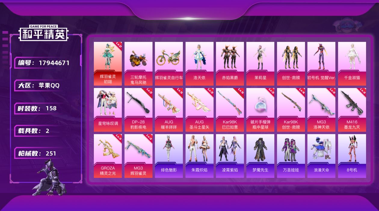 [17944671]1200红装碎片 苹果 手Q-1神装-7粉装-10特效枪-2载具-8粉色飞行器-77636热力值-4王牌印记-158套装-251枪皮