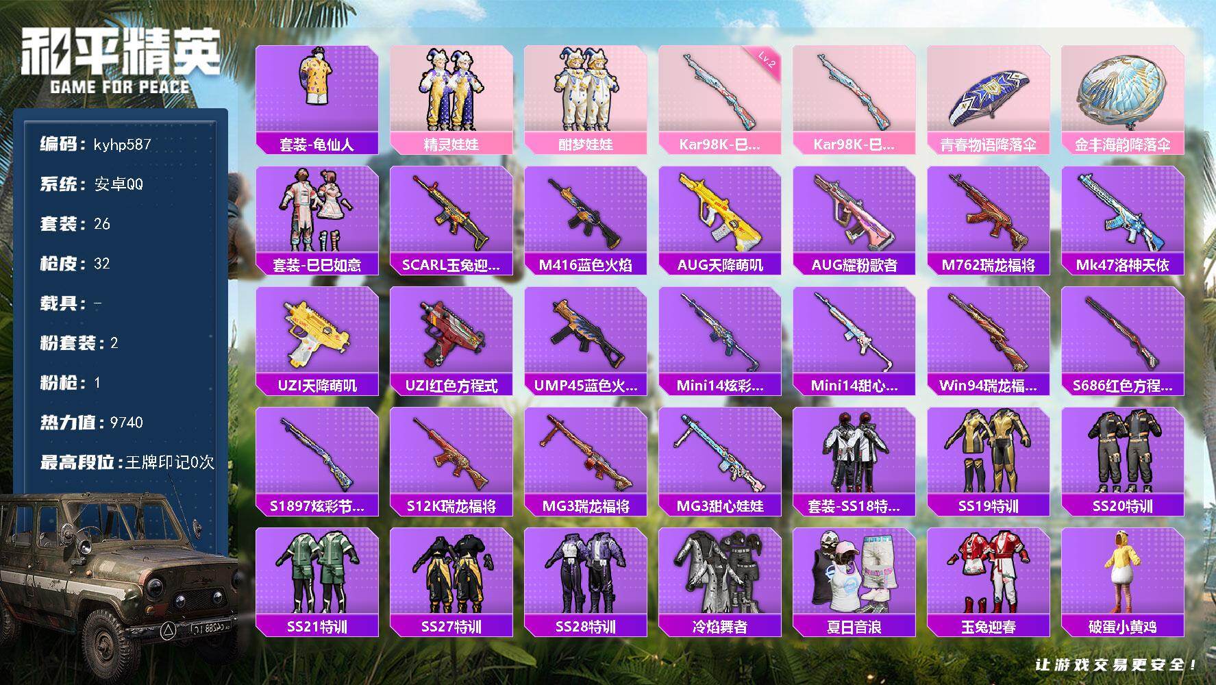 [17945941]安卓 手Q-2粉装-1特效枪-0载具-0粉色飞行器-9740热力值-1王牌印记-26套装-32枪皮