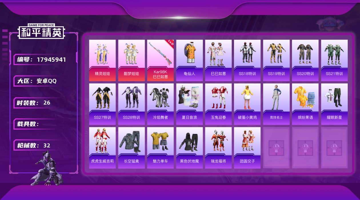 [17945941]安卓 手Q-2粉装-1特效枪-0载具-0粉色飞行器-9740热力值-1王牌印记-26套装-32枪皮 【热门品类】:套装-龟仙人 【粉色套装】:粉装-精灵娃娃,粉装-酣梦娃娃 【粉色枪皮等级】:Kar98K-巳巳如意(二级) 【粉色枪皮】:Kar98K-巳巳如意 【粉色降落伞】:青春物语降落伞,金丰海韵降落伞 【稀有套装】:套装-龟仙人,套装-巳巳如意 【稀有枪皮】:SCAR-L-玉兔迎春,M416-蓝色火焰,AUG-天降萌叽,AUG-耀粉歌者,M762-瑞龙福将,Mk47-洛神天依,UZI-天降萌叽,UZI-红色方程式,UMP45-蓝色火焰,Mini14-炫彩节奏,Mini14-甜心娃娃,Win94-瑞龙福将,S686-红色方程式,S1897-炫彩节奏,S12K-瑞龙福将,MG3-瑞龙福将,MG3-甜心娃娃 【其他套装】:套装-SS18特训,套装-SS19特训,套装-SS20特训,套装-SS21特训,套装-SS27特训,套装-SS28特训,套装-冷焰舞者,套装-夏日音浪,套装-玉兔迎春,套装-破蛋小黄鸡,套装-竞技名士,套装-缤纷果语,套装-耀眼新星,套装-虎虎生威吉莉,套装-长空猛禽,套装-魅力单车,套装-黑色伏地魔,套装-龟仙人,套装-瑞龙福将,套装-团圆交子 【营地ID】:938841970