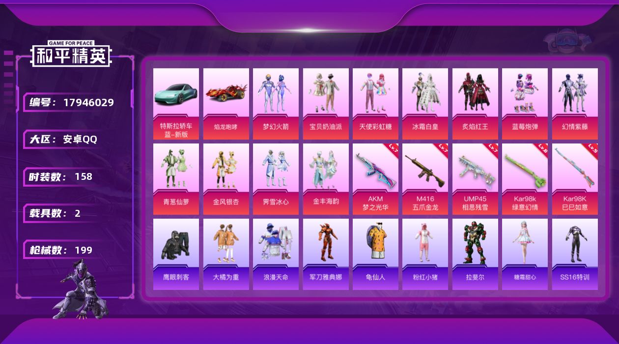 [17946029]【店主推荐捡漏号】安卓 手Q-11粉装-5特效枪-2载具-2粉色飞行器-68584热力值-14王牌印记-158套装-199枪皮【热门品类】:粉装-梦幻火箭,套装-浪漫天命,角色-军刀雅典娜,套装-龟仙人,套装-粉红小猪【粉色套装】:粉装-宝贝奶油派,粉装-天使彩虹糖,粉装-梦幻火箭,粉装-冰霜白皇,粉装-炙焰红王,粉装-蓝莓炮弹,粉装-幻情紫藤,粉装-青葱仙萝,粉装-金风银杏,粉装-霁雪冰心,粉装-金丰海韵【粉色枪皮等级】:AKM-梦之光华(七级),M416-五爪金龙(七级),UMP45-相思残雪(七级),Kar98K-绿意幻情(六级),Kar98K-巳巳如意(五级)【粉色载具】:特斯拉Roadster(水滴蓝),焰龙咆哮【粉色枪皮】:AKM-梦之光华,M416-五爪金龙,UMP45-相思残雪,Kar98K-绿意幻情,Kar98K-巳巳如意