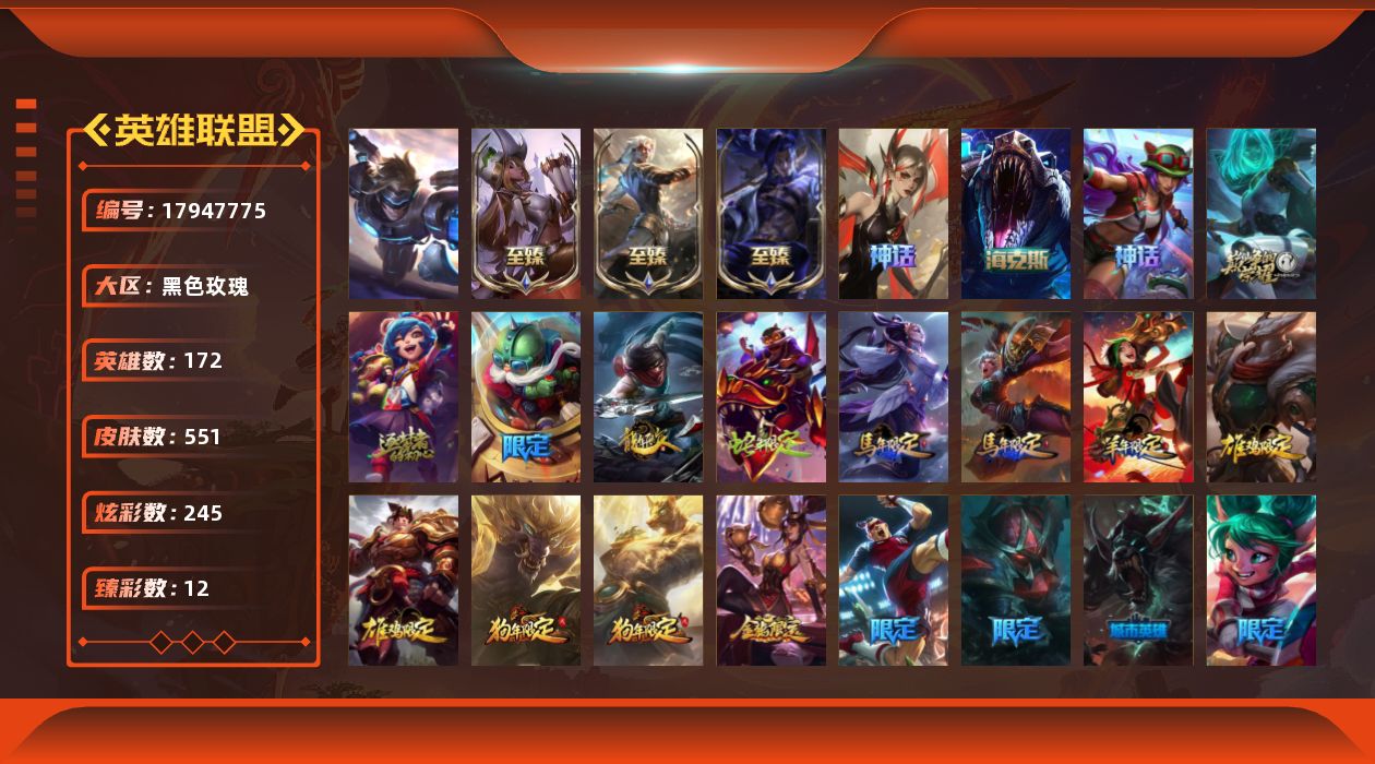[17947775]【店主推荐捡漏号】青铜段位-172英雄-551皮肤-245炫彩-1终极-9神话-87限定-52传说-143史诗