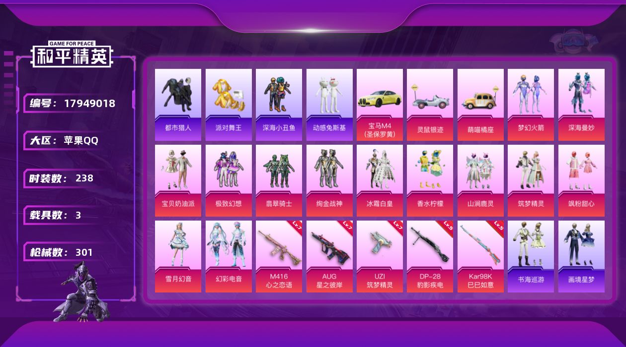 [17949018]苹果 手Q-13粉装-8特效枪-3载具-2粉色飞行器-94055热力值-20王牌印记-238套装-301枪皮
