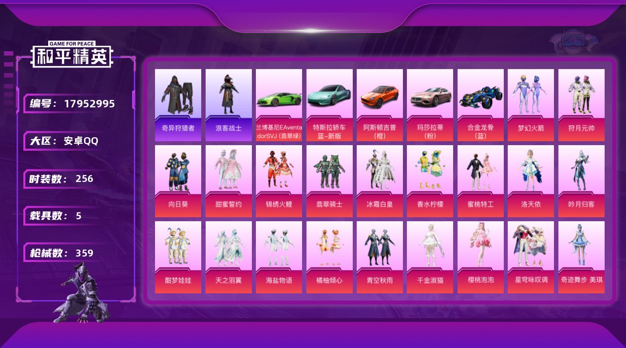[17952995]安卓 手Q-无敌战神框-21粉装-15特效枪-5载具-7粉色飞行器-128912热力值-26王牌印记-256套装-359枪皮