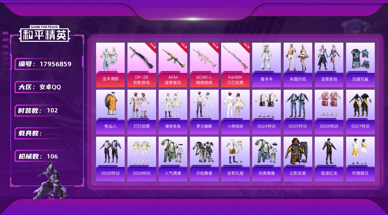 [17956859]安卓 手Q-2粉装-5特效枪-0载具-1粉色飞行器-33306热力值-1王牌印记-102套装-106枪皮 【热门品类】:套装-龟仙人 【粉色套装】:粉装-金丰海韵 【粉色枪皮等级】:AKM-绿萝繁花(五级),SCAR-L-锦绣绵绵(五级),Kar98K-巳巳如意(五级),DP-28-豹影疾电(五级) 【粉色枪皮】:AKM-绿萝繁花,SCAR-L-锦绣绵绵,Kar98K-巳巳如意,Mk14-福马献瑞,DP-28-豹影疾电 【粉色飞行器】:炫彩糖果飞行器 【粉色降落伞】:百万伏特降落伞,旋转彩虹降落伞,梦幻舞会降落伞,未来歌姬降落伞,闲梦青缨降落伞,魔法神域降落伞,异瞳寒姬降落伞,炫彩糖果降落伞 【稀有套装】:套装-龟仙人,套装-巳巳如意,套装-雏菊兔兔,套装-萝兰蝴蝶,套装-小熊娃娃,套装-朱霞炽焰,套装-凌霄紫焰,玩偶服-喜羊羊 【稀有枪皮】:AKM-霓虹街区,AKM-龙的传人,M16A4-幻世战舞者,M16A4-红色方程式,SCAR-L-夜灯,SCAR-L-红色方程式,M416-糯团青竹,M416-红色方程式,M416-蓝色火焰,GROZA-懵萌河马,AUG-天降萌叽,AUG-耀粉歌者,QBZ-未来歌姬,G36C-懵萌河马,AC-VAL-快闪甜心,蜜獾-天降萌叽,ARX-凌霄紫焰,UZI-啾咪啾咪,UZI-天降萌叽,UZI-红色方程式,UMP45-夜灯,UMP45-涂山之恋,UMP45-生命誓言,Vector-彩虹符号,Vector-生命誓言,汤姆逊-天降萌叽,JS9-凌霄紫焰,P90-快闪甜心,Kar98K-彩虹符号,Kar98K-红色方程式,AWM-圣堂之誓,SKS-炫彩节奏,VSS-彩虹符号,Mini14-涂山之恋,Mini14-耀粉歌者,莫辛纳甘-懵萌河马,MK20-H-快闪甜心,S686-彩虹符号,S686-红色方程式,S686-巳巳如意,S12K-玩趣呆呆,S12K-夜灯,DBS-圣堂之誓,M249-彩虹符号,M249-糯团青竹,DP-28-彩虹符号,MG3-幻世战舞者,PKM-懵萌河马,MG-36-凌霄紫焰,P92-凌霄紫焰,沙漠之鹰-快闪甜心,平底锅-凌霄紫焰,破片手榴弹-巳巳如意 【其他套装】:套装-SS24特训,套装-SS25特训,套装-SS26特训,套装-SS27特训,套装-SS28特训,套装-SS29特训,套装-人气偶像,套装-冷焰舞者,