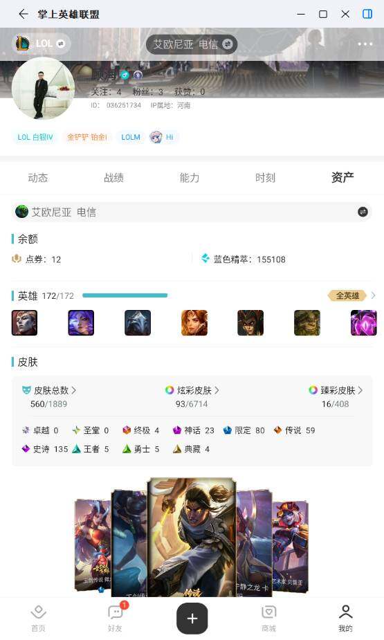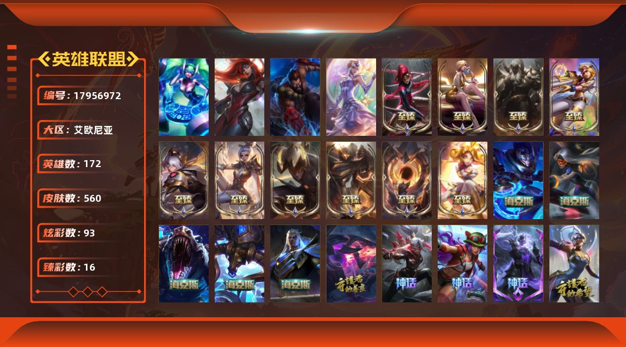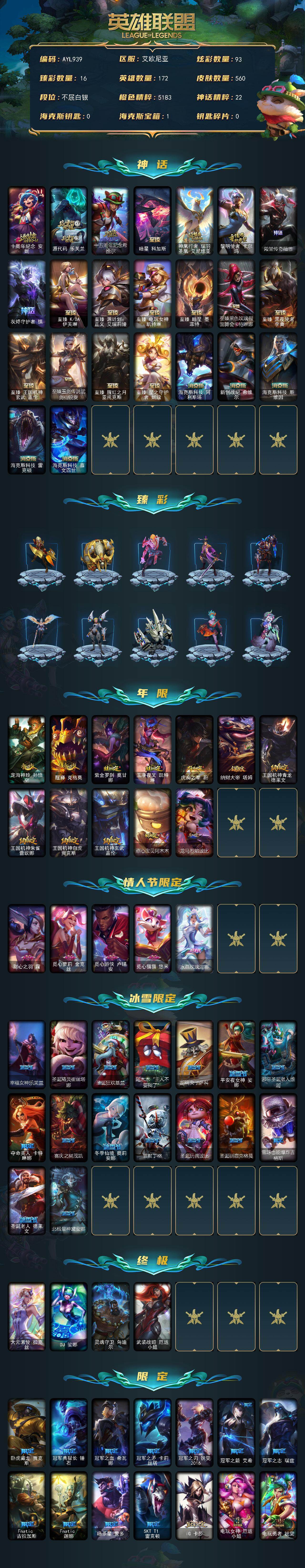 [17956972]白银段位-172英雄-560皮肤-93炫彩-4终极-23神话-80限定-59传说-135史诗