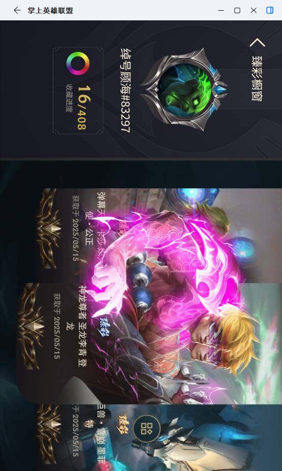 【臻彩皮肤】:天龙之子卡莎飞龙乘云,墨之影武者亚索金墨耀影,征服者韦鲁斯炫金,征服者阿利斯塔炫金,神龙尊者圣龙李青登龙,玉剑传说无极麒麟,玉剑传说无劫胭脂,玉剑传说翼剑仙珠光,弹幕天使卡莎炽天使公正,霸天巨兽雪崩墨菲特,灵魂莲华锐雯流火,魔女阿卡丽虚荣,净雪之月莫甘娜冬虹,心之钢伊泽瑞尔天纵才华