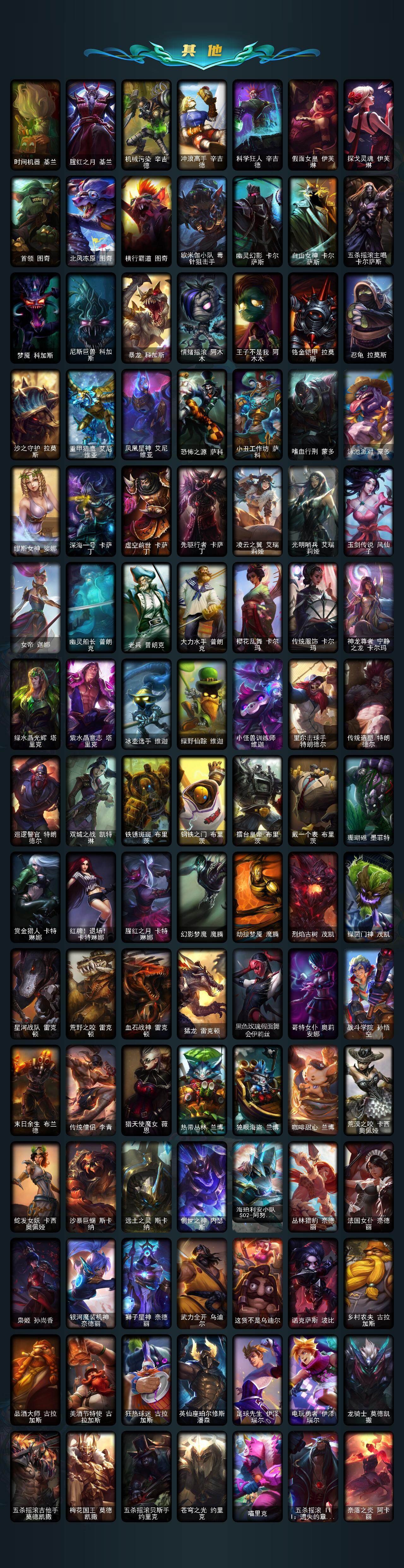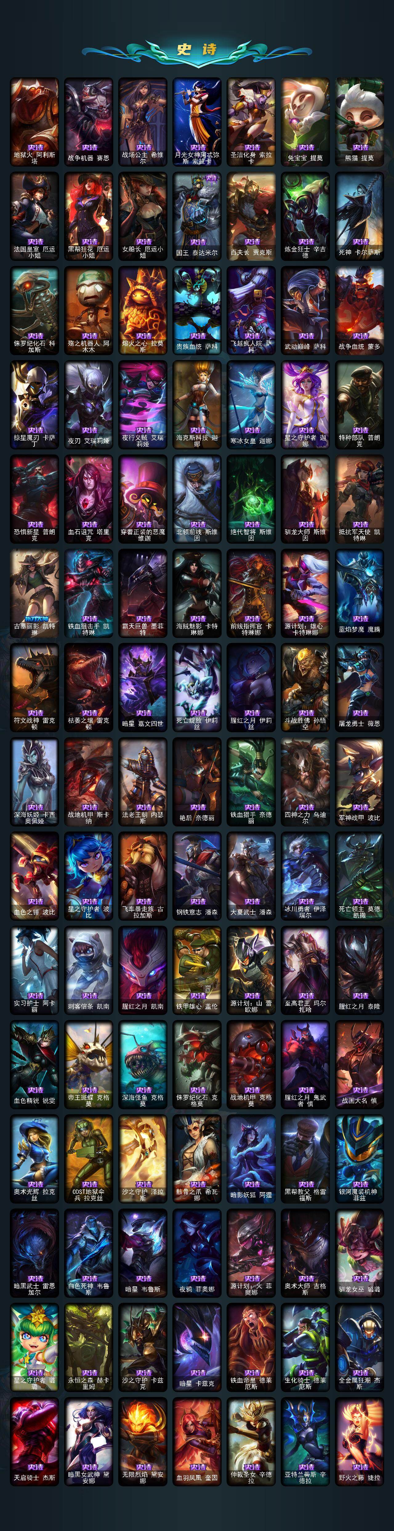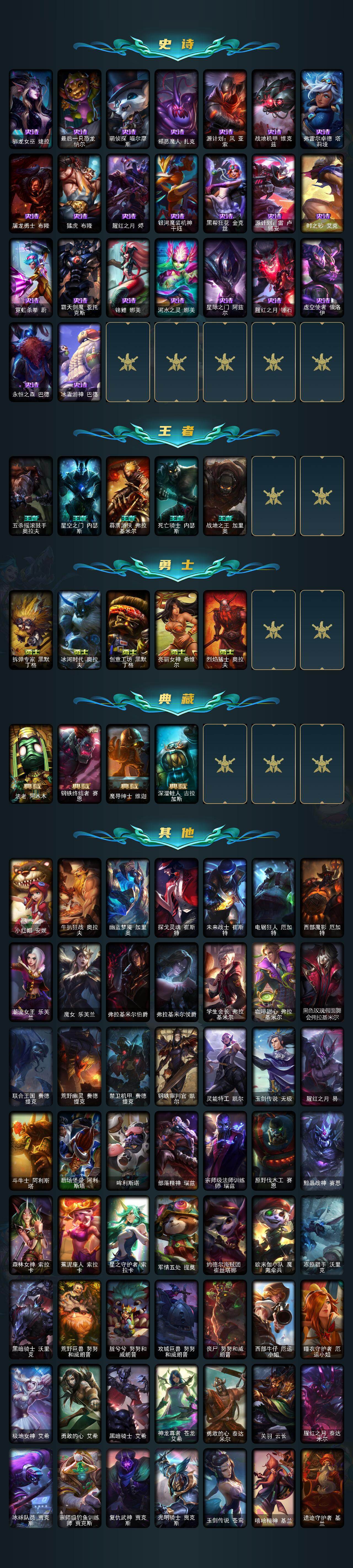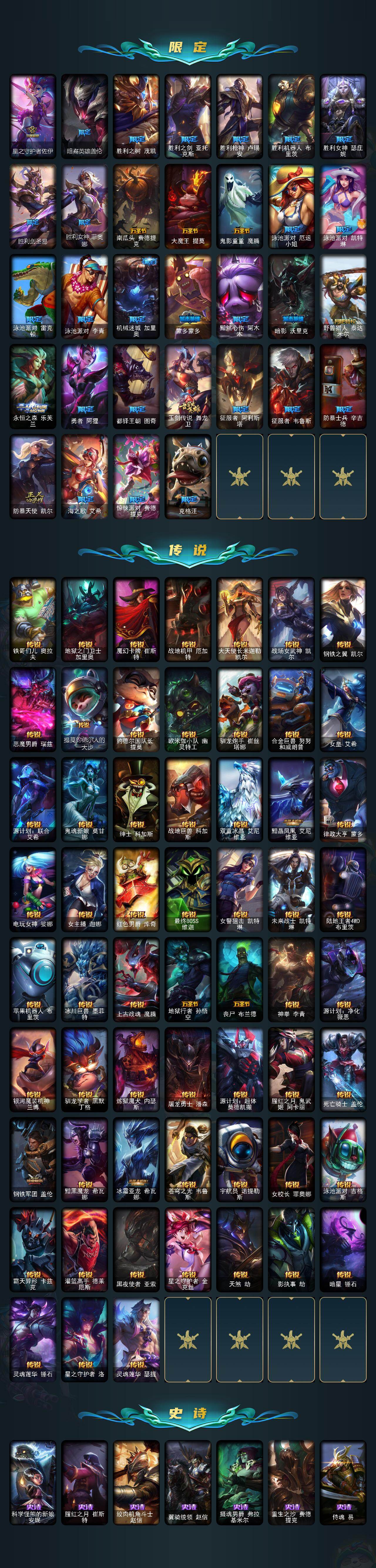 【年限皮肤】:定海神珍孙悟空,醒狮克格莫,紫金罗刹莫甘娜,玉净夜叉凯特琳,虎痴之拳蔚,纳财大帝塔姆,王国机神青龙德莱文,王国机神朱雀蕾欧娜,王国机神白虎贾克斯,王国机神玄武盖伦,点心宝贝阿木木,龙马烈焰波比
