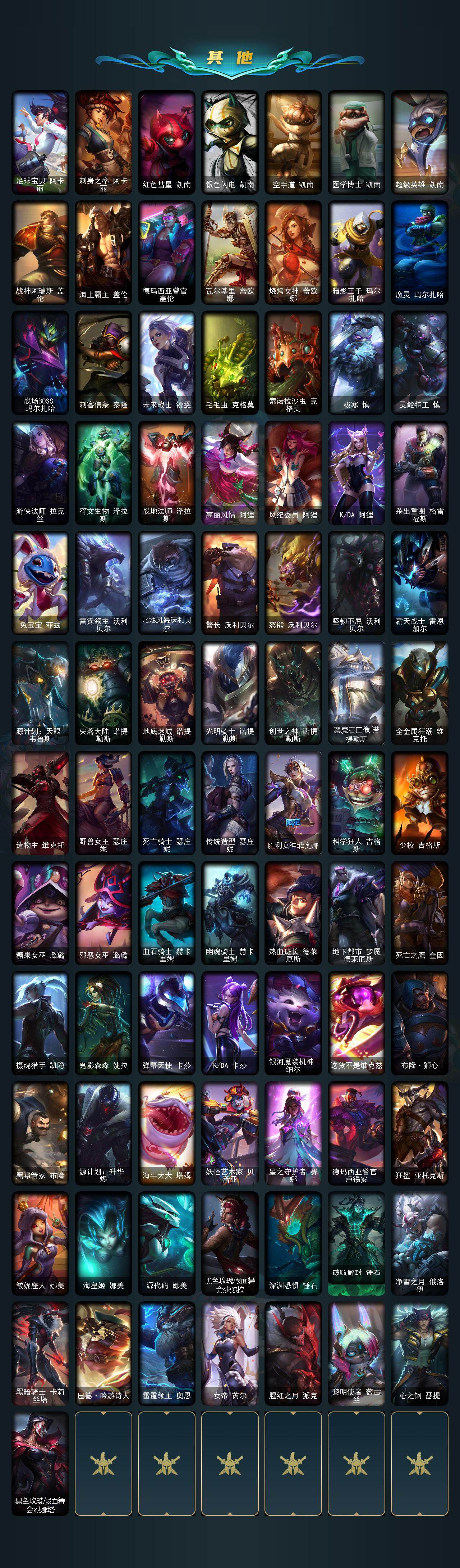 【至臻皮肤】:至臻KDA伊芙琳,至臻源计划正义艾瑞莉娅,至臻电玩女神凯特琳,至臻暗星墨菲特,至臻黑色玫瑰假面舞会卡特琳娜,至臻黑夜使者李青,至臻王国机神玄武盖伦,至臻玉剑传说武剑仙锐雯,至臻腥红之月亚托克斯,至臻星之守护者妮蔻