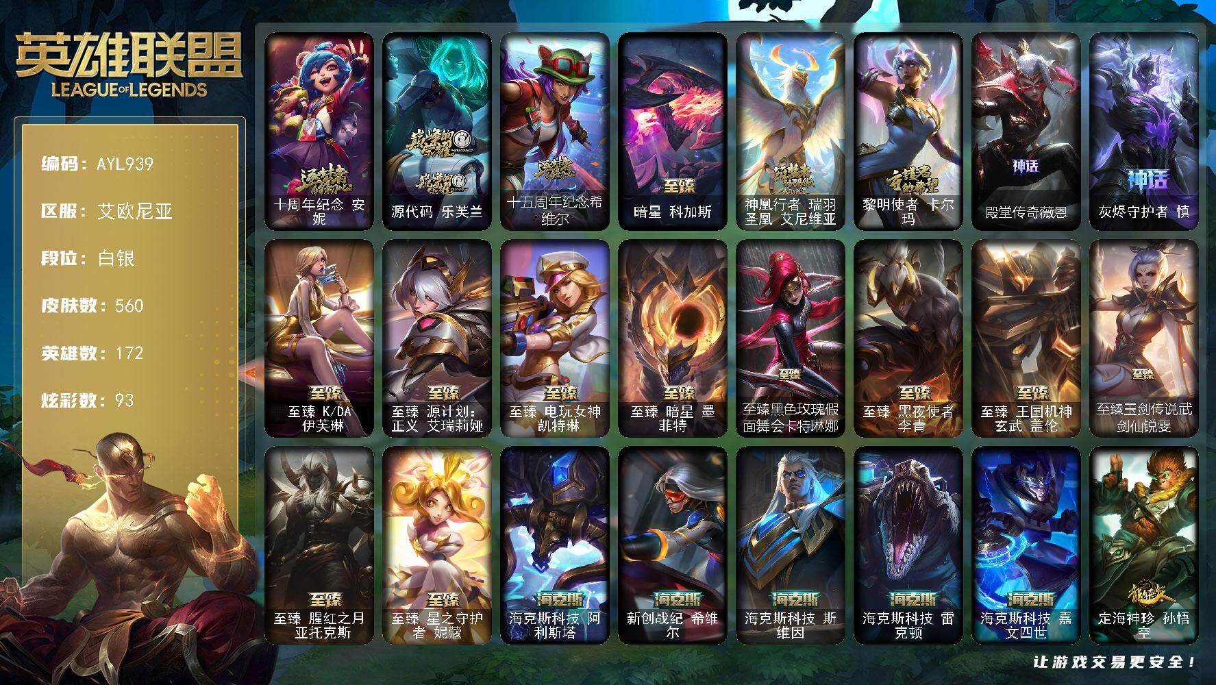 [17956972]白银段位-172英雄-560皮肤-93炫彩-4终极-23神话-80限定-59传说-135史诗 【神话皮肤】:十周年纪念安妮,源代码乐芙兰,十五周年纪念希维尔,暗星科加斯,神凰行者瑞羽圣凰艾尼维亚,黎明使者卡尔玛,殿堂传奇薇恩,灰烬守护者慎 【至臻皮肤】:至臻KDA伊芙琳,至臻源计划正义艾瑞莉娅,至臻电玩女神凯特琳,至臻暗星墨菲特,至臻黑色玫瑰假面舞会卡特琳娜,至臻黑夜使者李青,至臻王国机神玄武盖伦,至臻玉剑传说武剑仙锐雯,至臻腥红之月亚托克斯,至臻星之守护者妮蔻 【海克斯皮肤】:海克斯科技阿利斯塔,新创战纪希维尔,海克斯科技斯维因,海克斯科技雷克顿,海克斯科技嘉文四世 【臻彩皮肤】:天龙之子卡莎飞龙乘云,墨之影武者亚索金墨耀影,征服者韦鲁斯炫金,征服者阿利斯塔炫金,神龙尊者圣龙李青登龙,玉剑传说无极麒麟,玉剑传说无劫胭脂,玉剑传说翼剑仙珠光,弹幕天使卡莎炽天使公正,霸天巨兽雪崩墨菲特,灵魂莲华锐雯流火,魔女阿卡丽虚荣,净雪之月莫甘娜冬虹,心之钢伊泽瑞尔天纵才华 【年限皮肤】:定海神珍孙悟空,醒狮克格莫,紫金罗刹莫甘娜,玉净夜叉凯特琳,虎痴之拳蔚,纳财大帝塔姆,王国机神青龙德莱文,王国机神朱雀蕾欧娜,王国机神白虎贾克斯,王国机神玄武盖伦,点心宝贝阿木木,龙马烈焰波比 【情人节限定】:甜心之羽霞,觅心萝莉金克丝,觅心游侠卢锡安,觅心猫猫悠米,水晶玫瑰迦娜 【冰雪限定】:幸福女神乐芙兰,圣诞精灵崔丝塔娜,圣诞狂欢基兰,阿木木“主人不要我了”,胡桃夹子萨科,平安夜女神娑娜,邪恶圣诞老人维迦,夺命美人卡特琳娜,喜庆之树茂凯,冬季仙境奥莉安娜,雪默丁格,圣诞玩偶波比,圣诞驯鹿克格莫,雪球也能爆炸吉格斯,圣诞老人德莱文,北极星神黛安娜 【终极皮肤】:大元素使拉克丝,DJ娑娜,灵魂守卫乌迪尔,武装战姬厄运小姐 【限定皮肤】:卧虎藏龙贾克斯,冠军典狱长锤石,冠军之血希瓦娜,冠军之矛卡莉丝塔,冠军之刃锐雯2016,冠军之箭艾希,冠军之志瑞兹,Fnatic古拉加斯,Fnatic迦娜,暗杀星蒙多,SKTT1雷克顿,iG卡莎,电玩女神厄运小姐,电玩勇者锐雯,星之守护者佐伊,暗裔英雄盖伦,胜利之树茂凯,胜利之剑亚托克斯,胜利枪神卢锡安,胜利机器人布里茨,胜利女神瑟庄妮,胜利剑圣易,胜利女神菲奥娜,南瓜头费德提克,大魔王提莫,鬼影重重魔腾,泳池派对厄运小姐,泳池派对凯特琳,泳池派对雷克顿,泳池