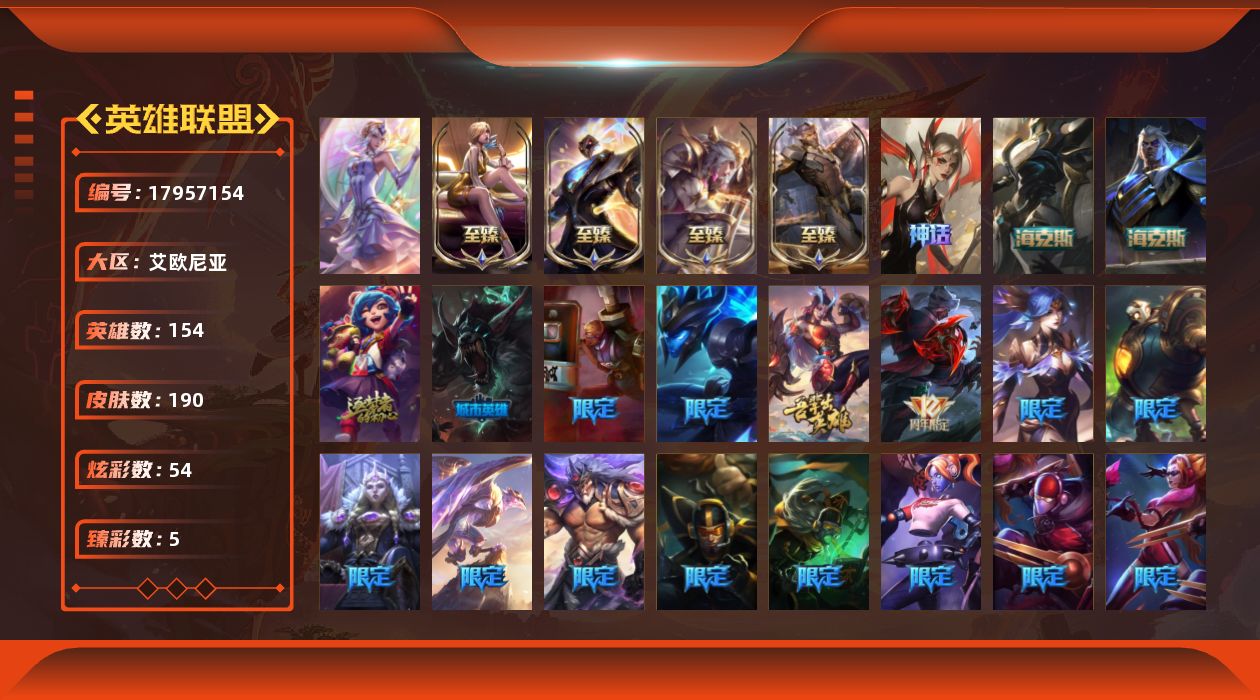 [17957154]未定级段位-154英雄-190皮肤-54炫彩-1终极-9神话-31限定-18传说-40史诗