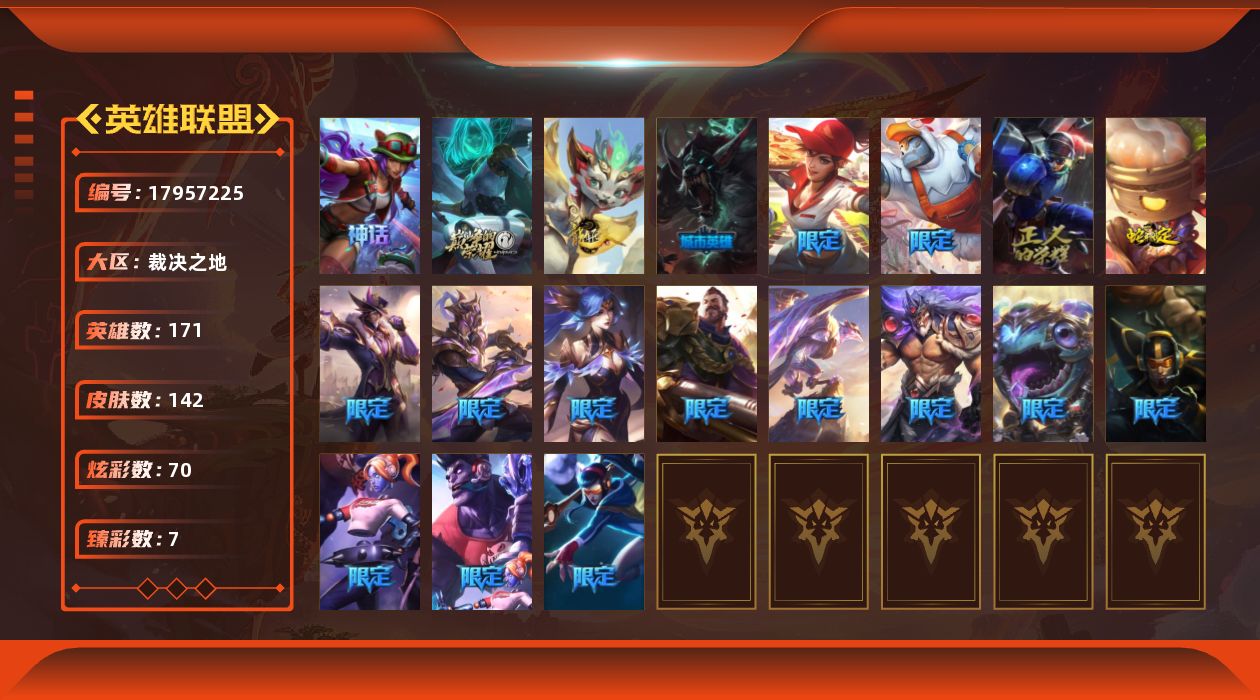 [17957225]青铜段位-171英雄-142皮肤-70炫彩-0终极-2神话-19限定-6传说-34史诗