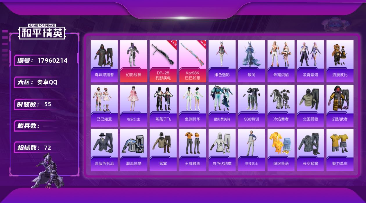 [17960214]可二次【特价出售/店主推荐】安卓 手Q-1粉装-4特效枪-19112热力值-2王牌印记-55套装-72枪皮【热门品类】:套装-奇异狩猎者,套装-浪漫波比【粉色套装】:粉装-幻影战神【粉色枪皮等级】:ACE32-萌骑漫游(五级),Kar98K-巳巳如意(五级),Mk14-福马献瑞(五级),DP-28-豹影疾电(五级)