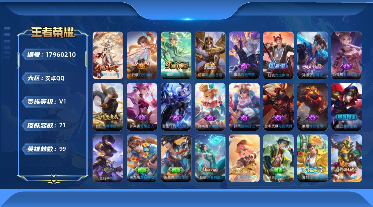 [17960210]安卓Q-V0-尊贵铂金II段位-99英雄-71皮肤-4传说-12史诗