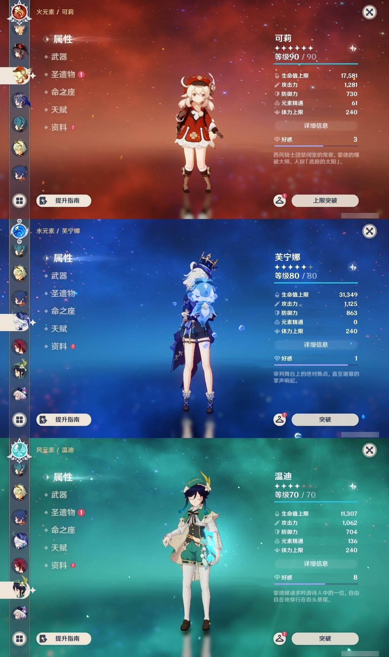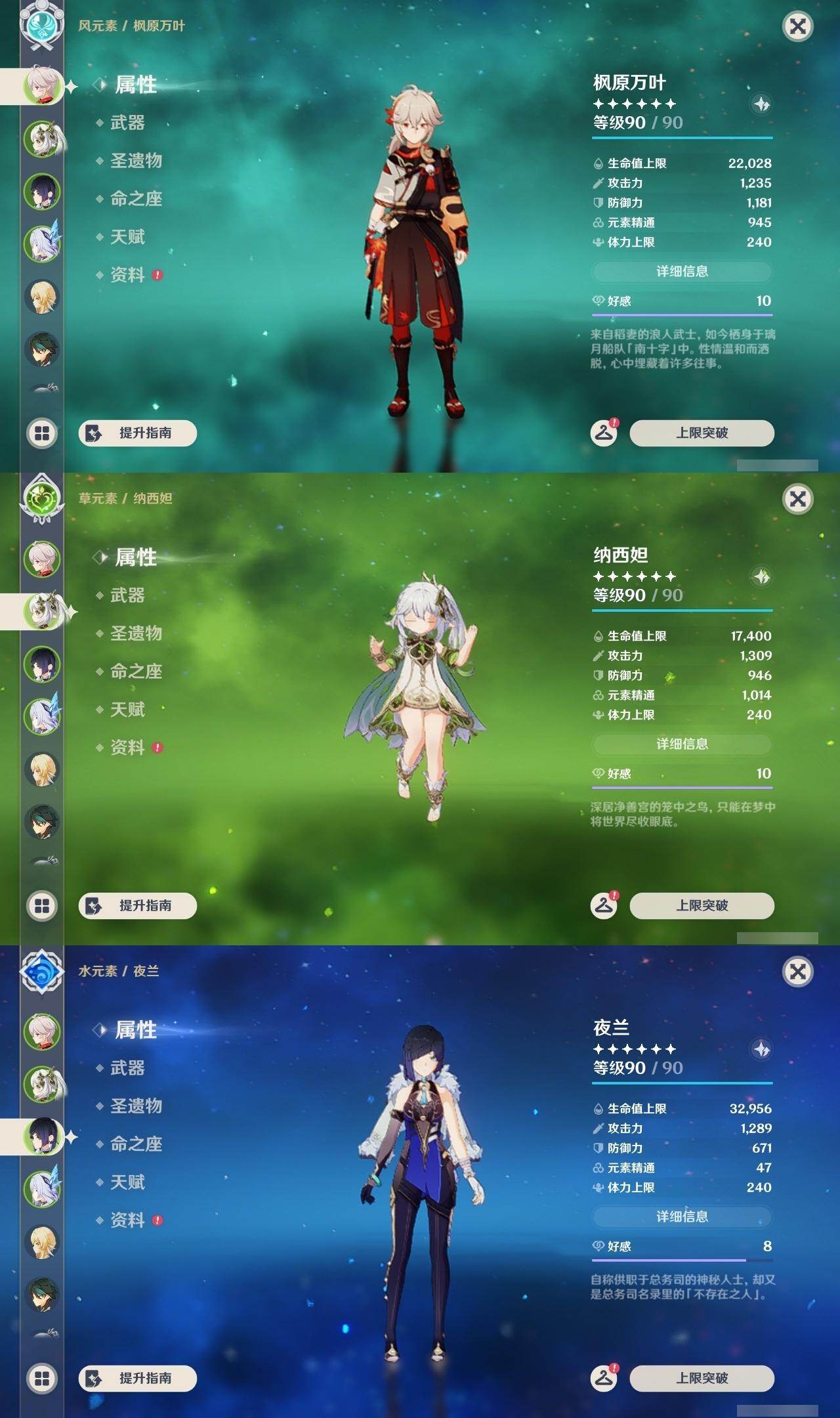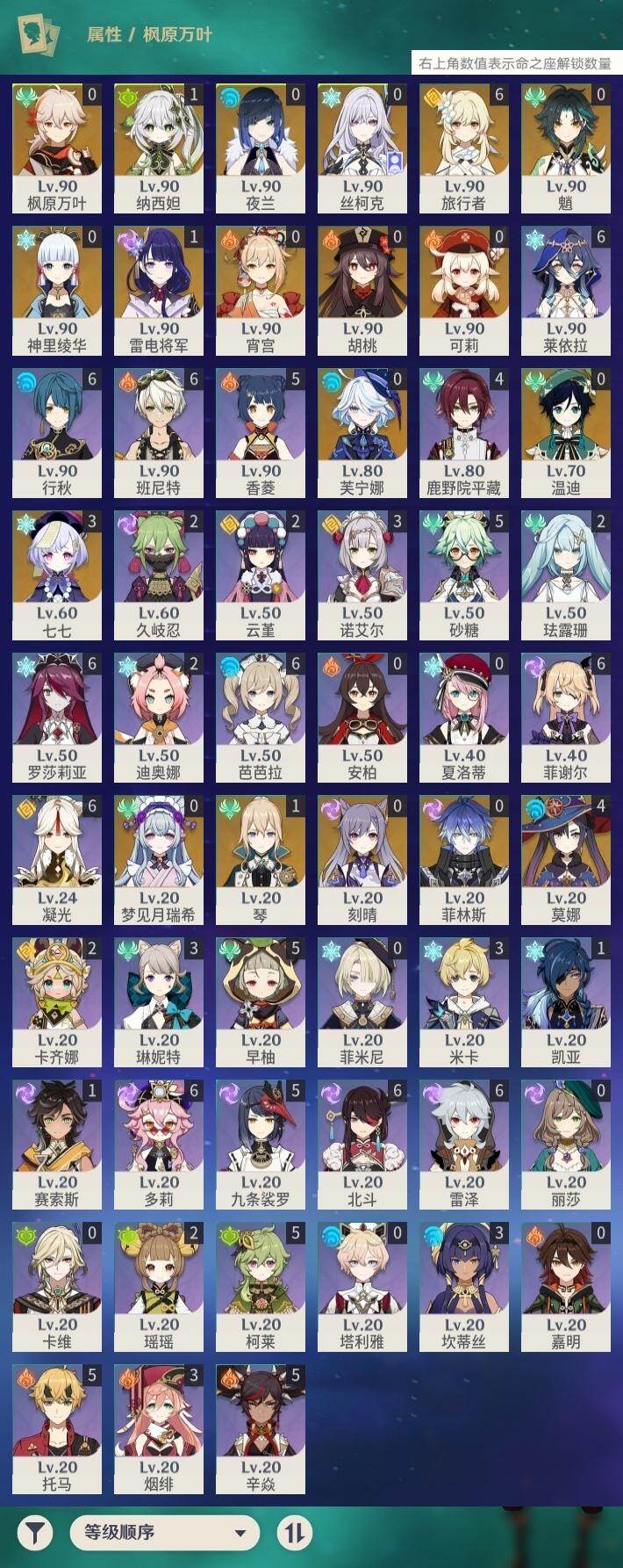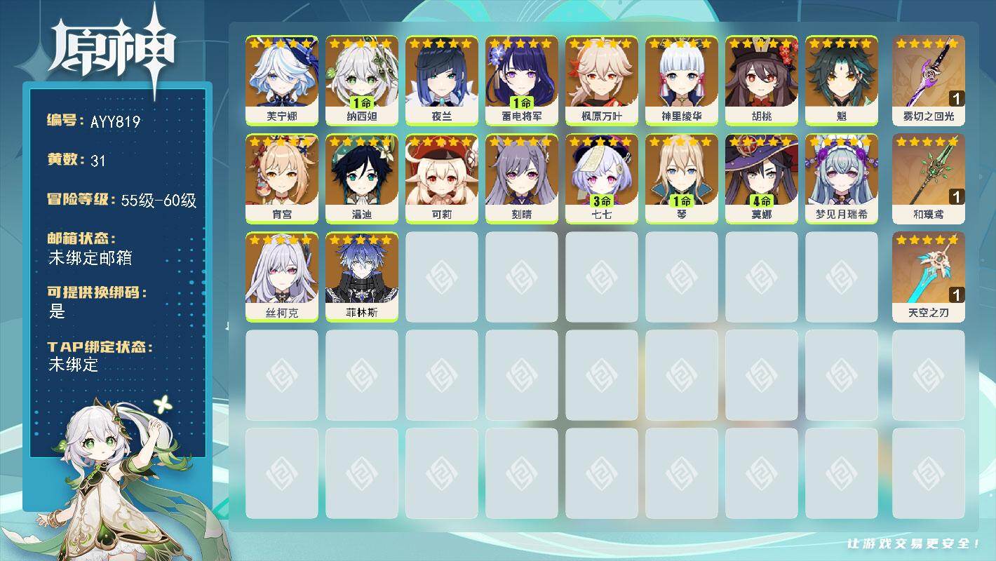 [17960514]58级/31黄/女主/18个五星角色/3个五星武器 0命芙宁娜,1命纳西妲,0命夜兰,1命雷电将军,0命枫原万叶,0命神里绫华,0命胡桃,0命魈,0命宵宫,0命温迪,0命可莉,0命刻晴,3命七七,1命琴,4命莫娜,0命梦见月瑞希,0命丝柯克,0命菲林斯,精1雾切之回光,精1和璞鸢,精1天空之刃
