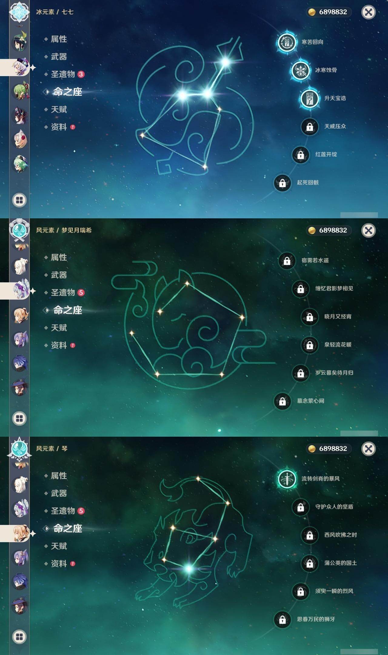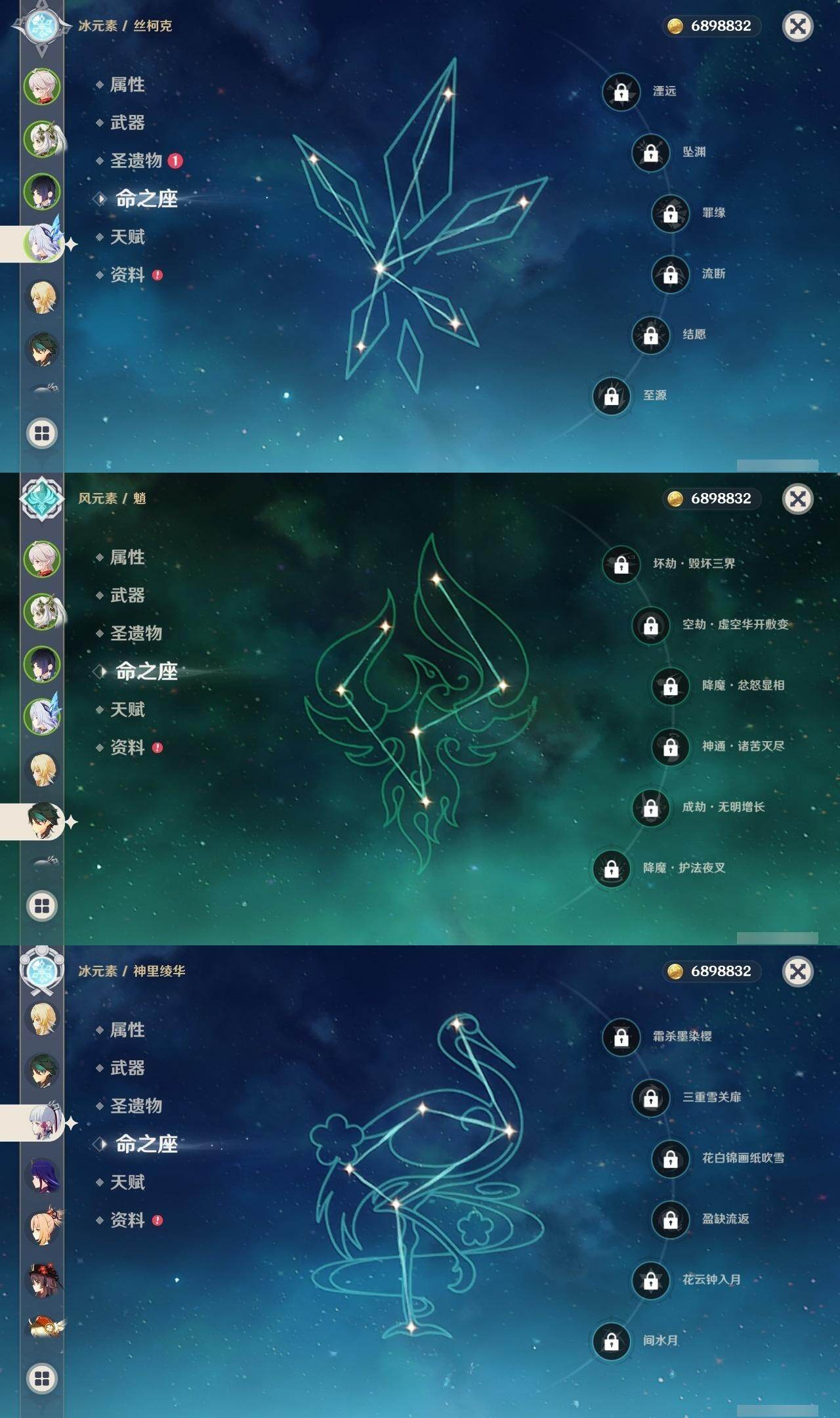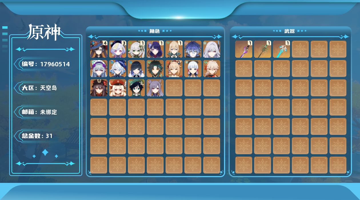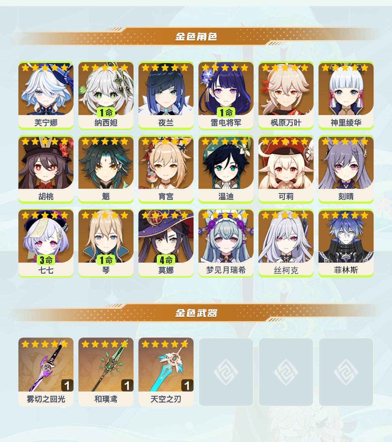 0命芙宁娜,1命纳西妲,0命夜兰,1命雷电将军,0命枫原万叶,0命神里绫华,0命胡桃,0命魈,0命宵宫,0命温迪,0命可莉,0命刻晴,3命七七,1命琴,4命莫娜,0命梦见月瑞希,0命丝柯克,0命菲林斯,精1雾切之回光,精1和璞鸢,精1天空之刃